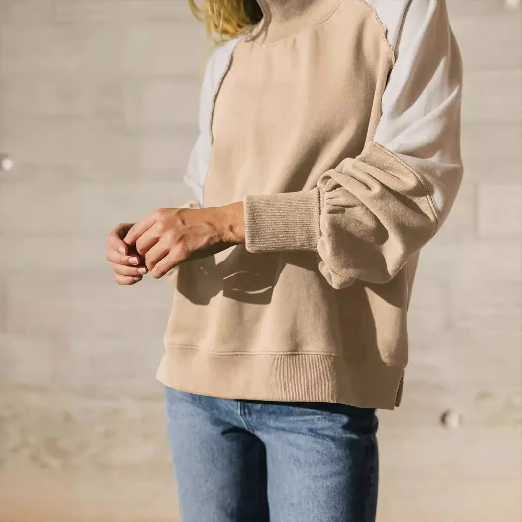 Contrast Color Rib Sleeve Hoodies Stand Neck Women's Hoodies Sweatshirt Loose Casual Pullover Tops
