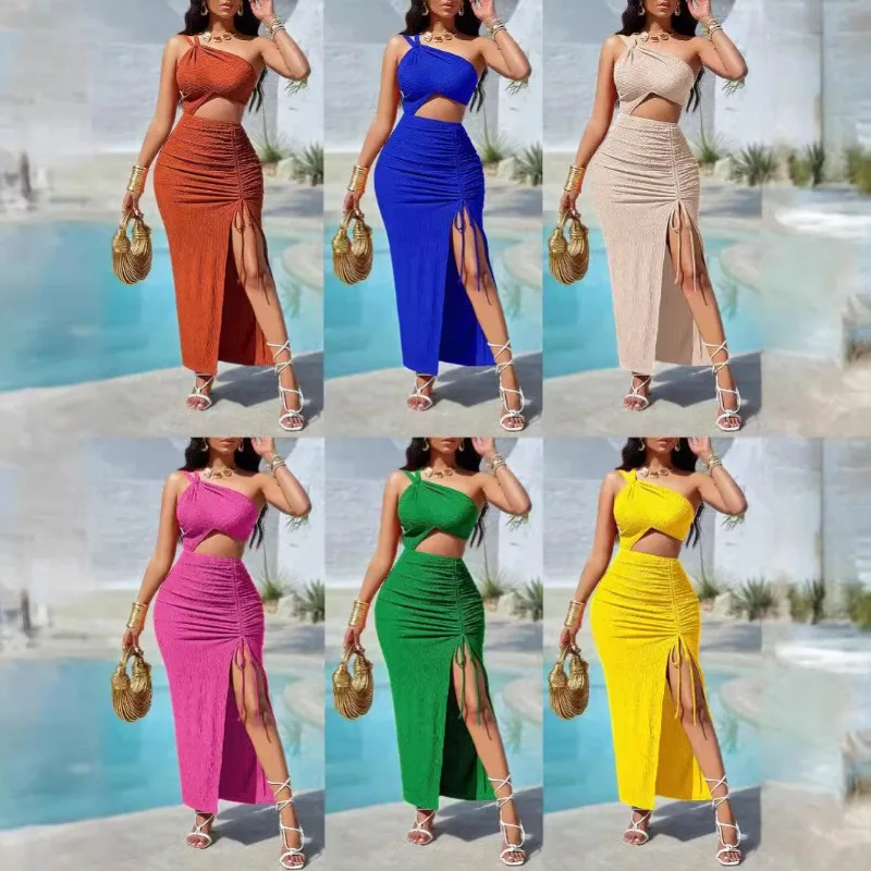 One Shoulder Strap Sexy Dress Hollow Out Waist Shirring WomenCandy Color Lady Dress High Split Maxi Vestidos