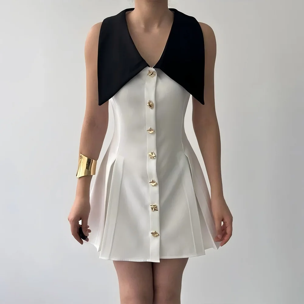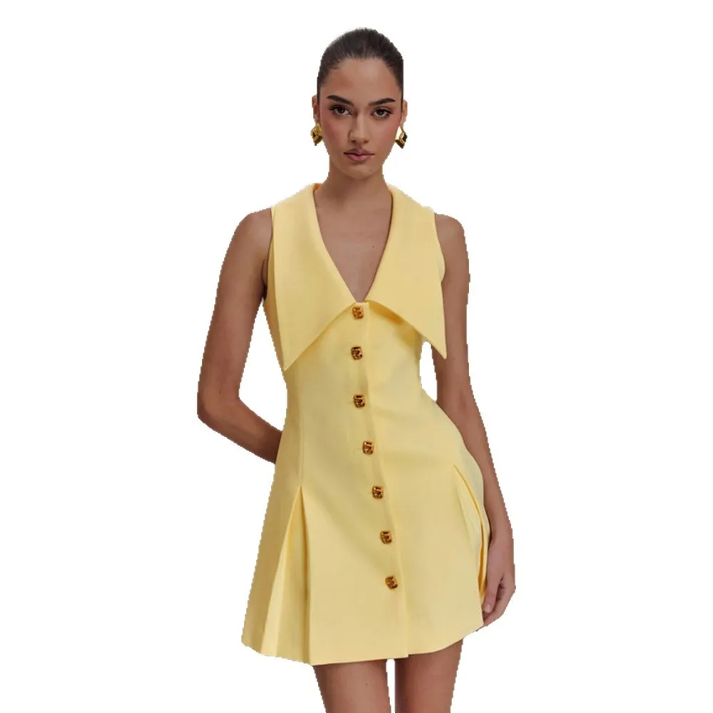 Large Lapel Sleeveless Short Dress with Single Row Metal Buttons Fashionable Slimming Women Dress Short Skirt