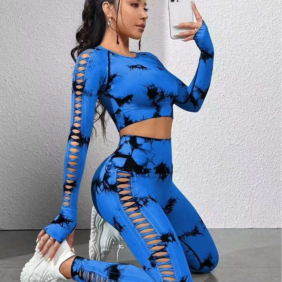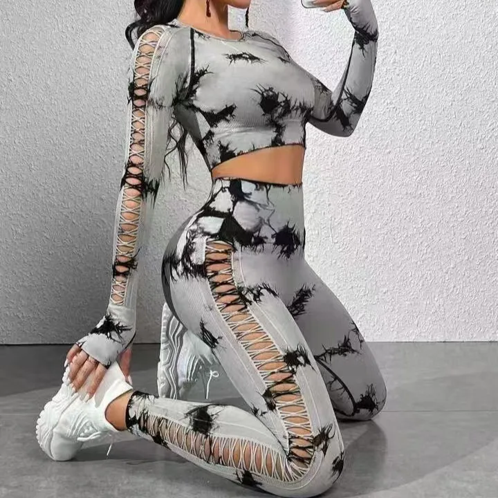 long leggings yoga sets Outdoor sports quick drying tight fitting high waist hip lifting fitness side hollow tie dye yoga set