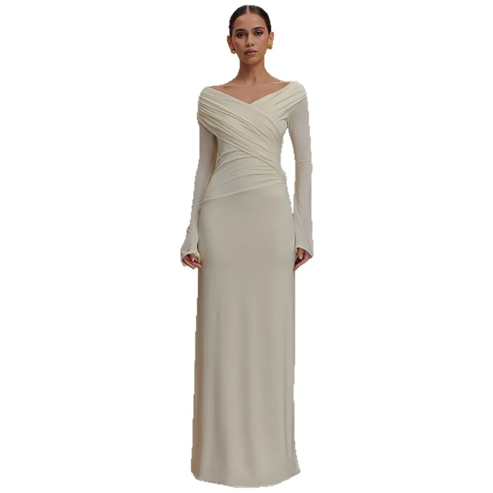 Slim Fit Shirring Women's Long Dress Sexy V-neck Long Sleeved Party Style Evening Dress