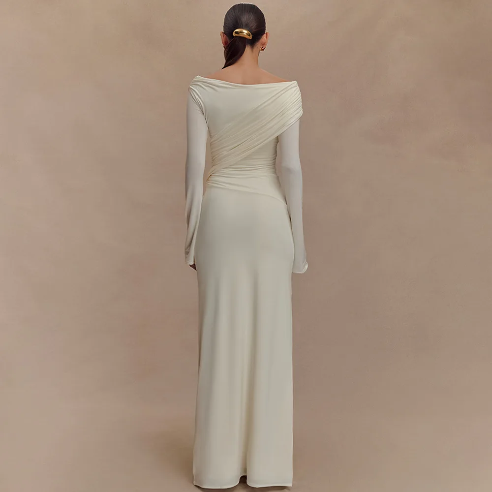 ZYHT 73849 European Wholesale Fashion Casual One Shoulder Ruched Maxi Dress Side Slit Pleated Long Sleeve Dresses for Women