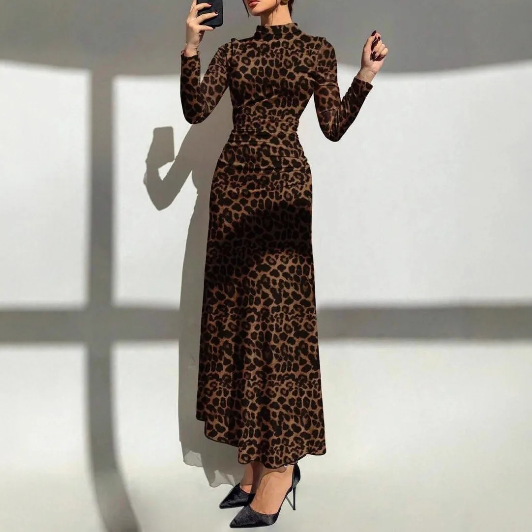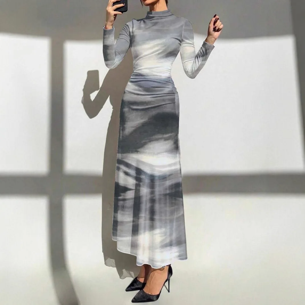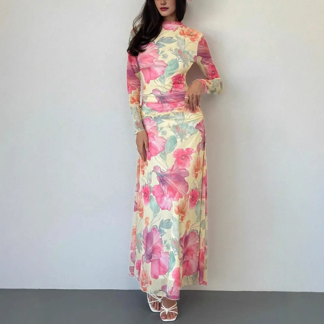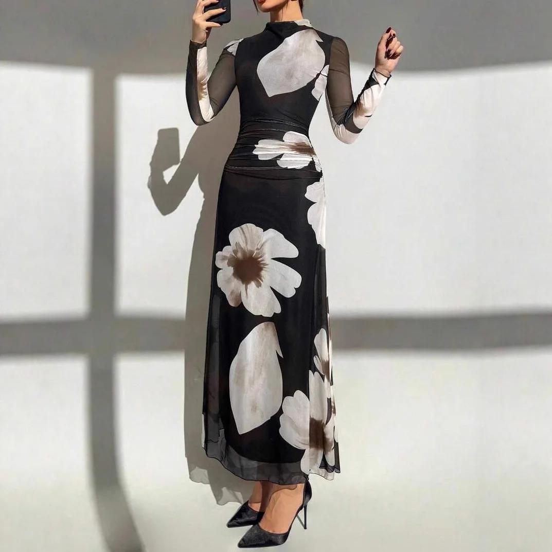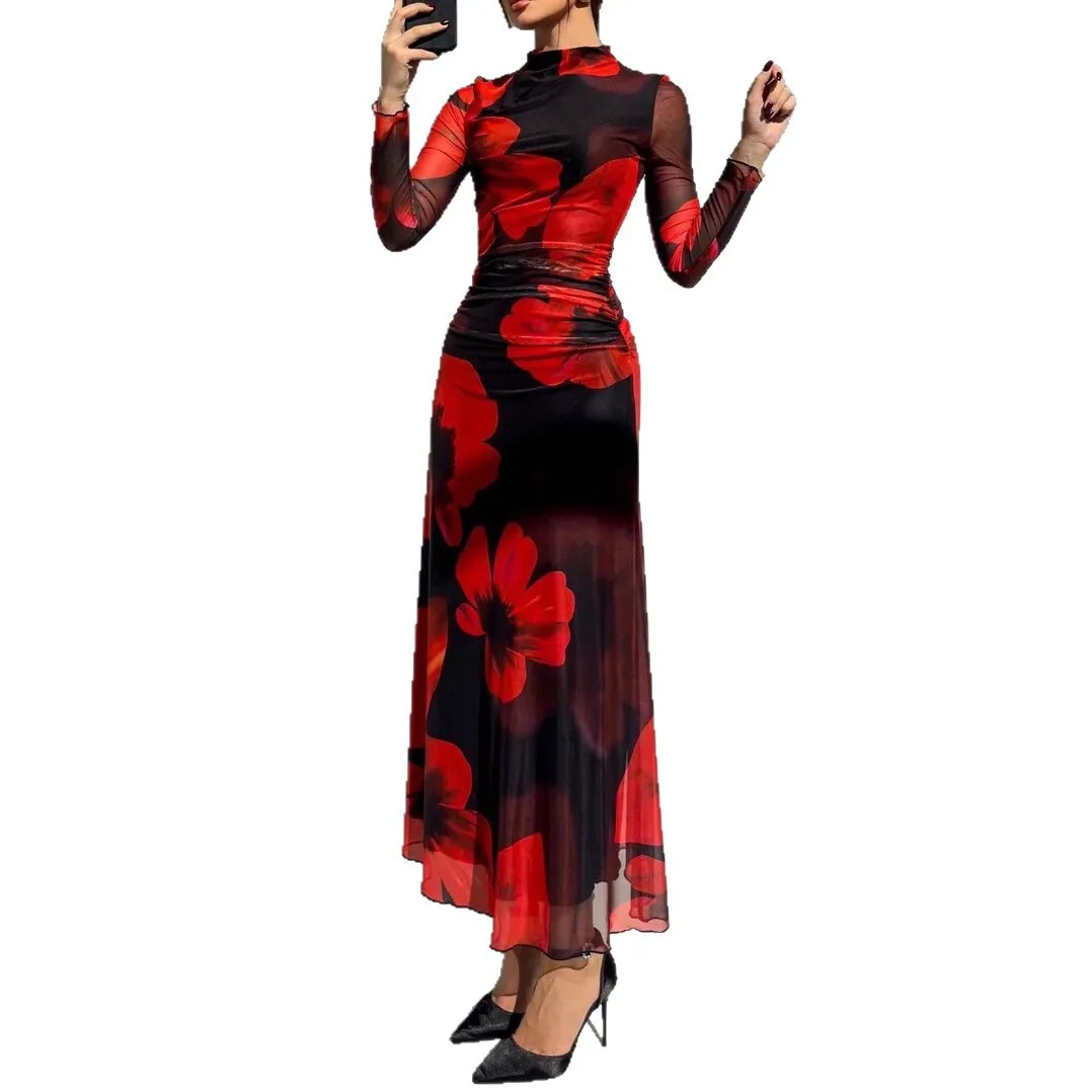 New Floral Mesh Printed Party Dress Long Sleeved Slim Fit Women Dress for Vacation Plus Size