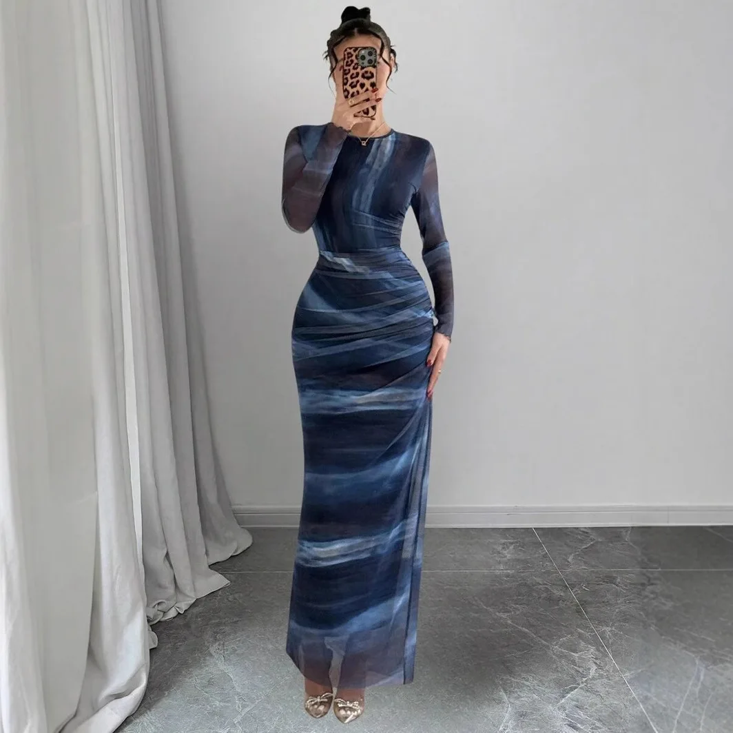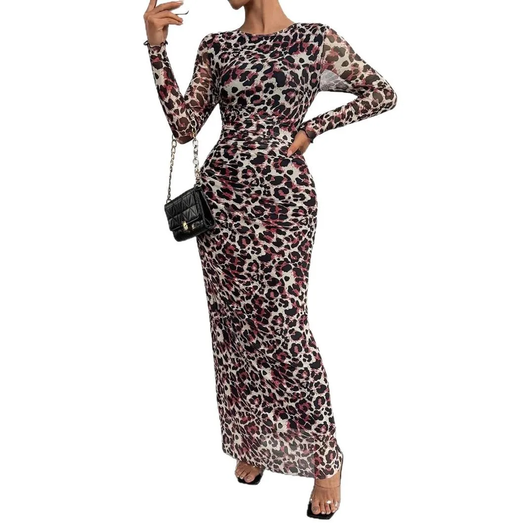 Classic Leopard Print Dress Pleated Sexy Tight Mesh Bodycon Dress Round Neck Long Dresses Women
