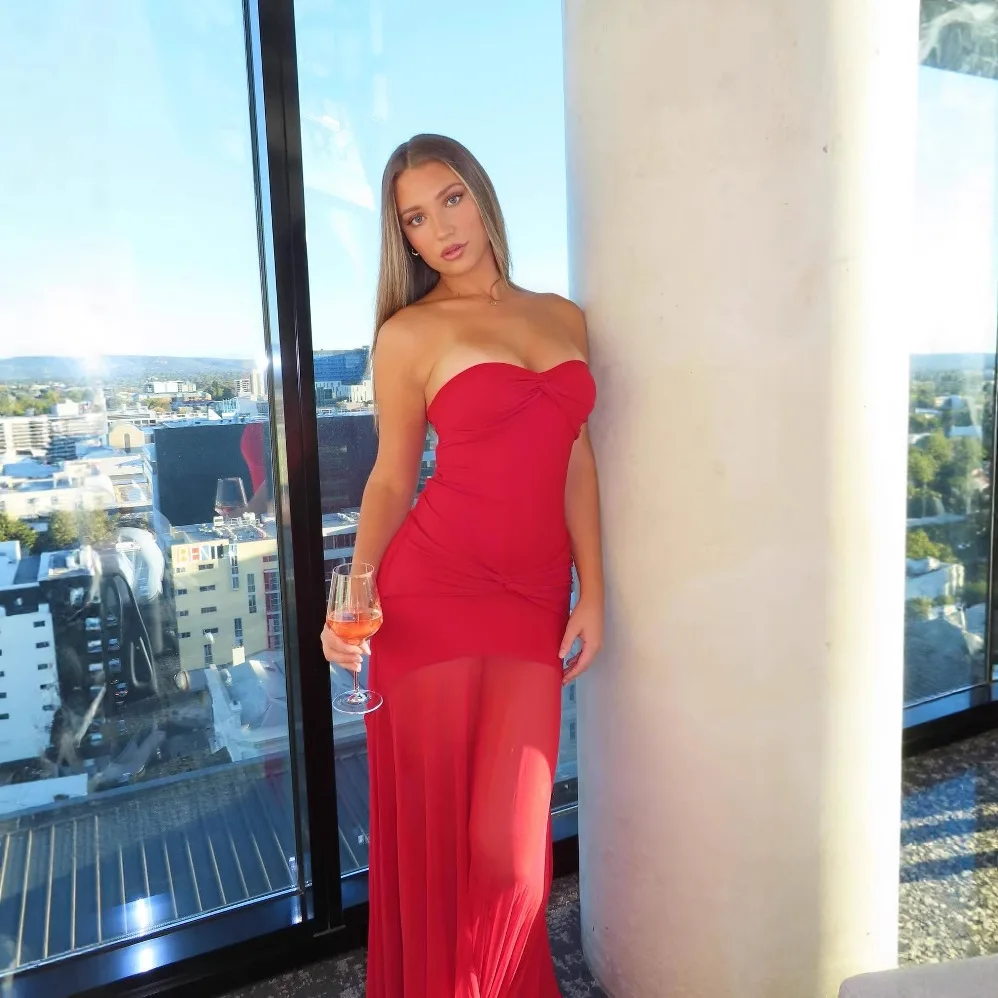 Off Shoulder Strapless Long Dress Tight Fitting Sexy Bodycon Dresses Backless Pleated Mesh Vestidos