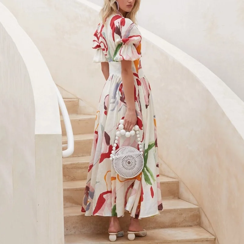 Elegant Large Swing Long Dress Short Sleeve Printing Chiffon Beach Dress Women Clothing