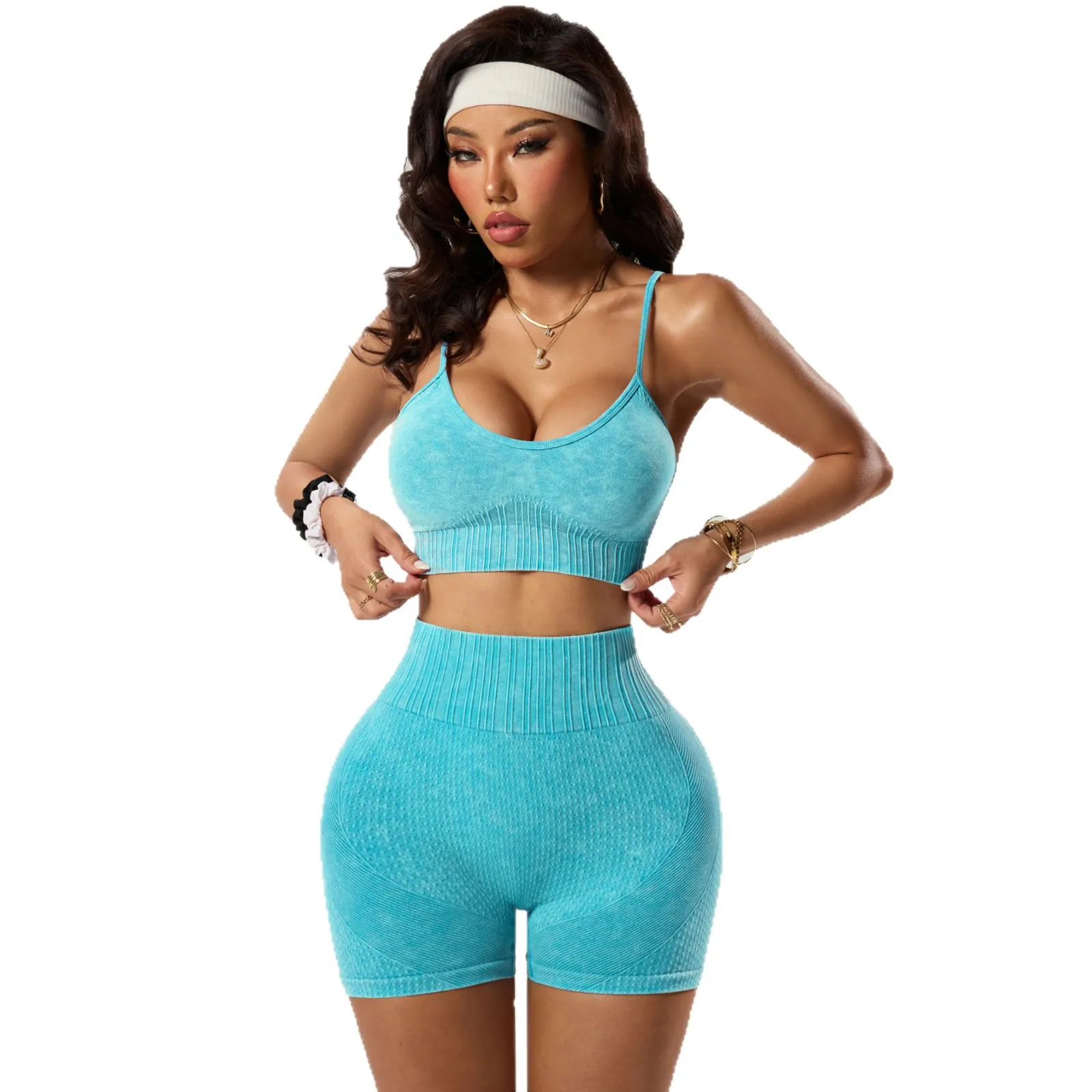 Sand Washed Yoga Sets High Waisted Hip Lifting Sports Suits Bra and Shorts Two Pieces Sets Shock-absorbing Yoga Shorts