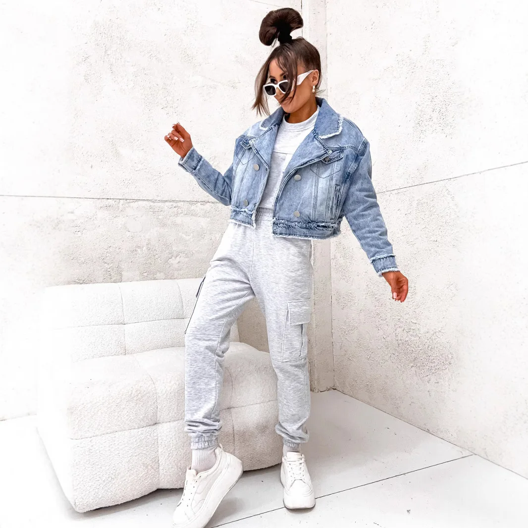 Long Sleeved Short Jacket Loose Washed Denim Coat with Frayed Edges Distressed Vintage Women's Denim Jacket