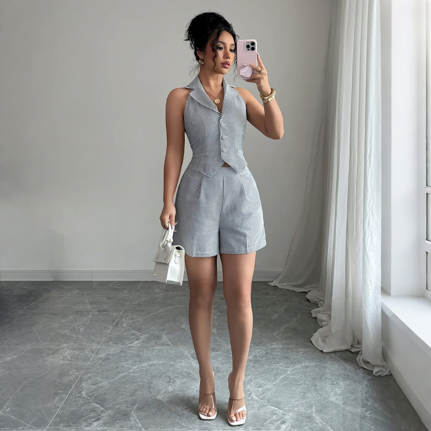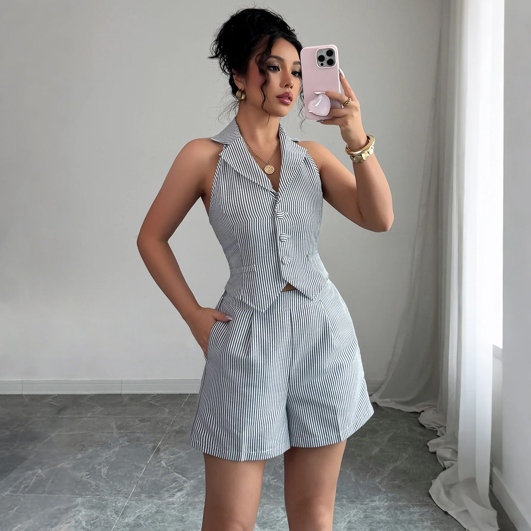 Sleeveless Shirts Elegant Button Vest Striped Women's Suits Turn Down Collar Shorts Set for Women Summer Two Pieces Sets