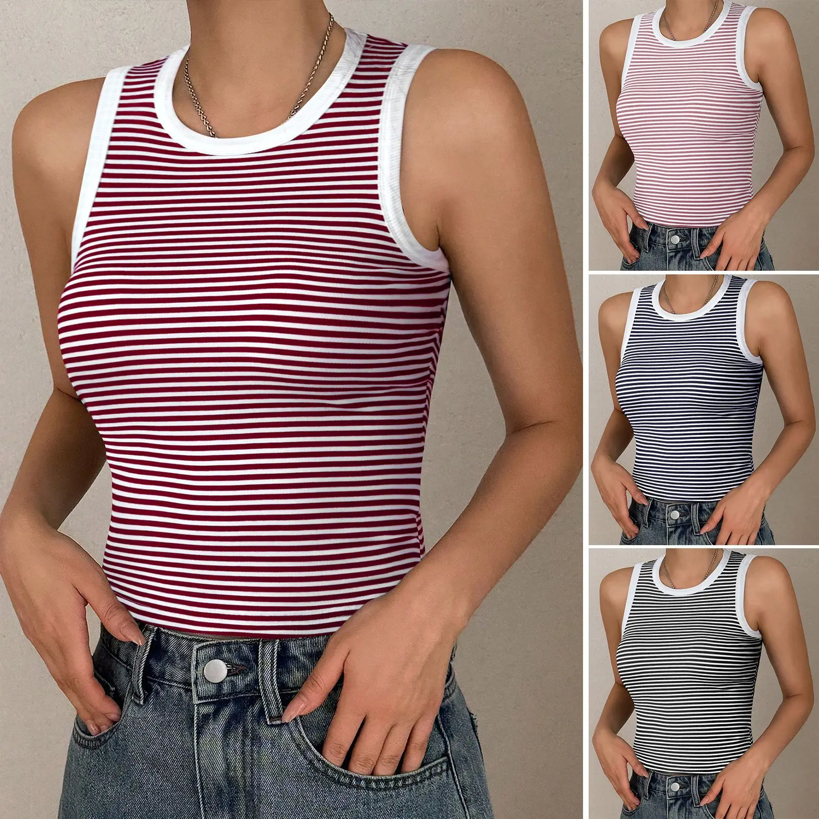 2026 Summer Tank Tops Casual Sports Style T Shirt Round Neck Knitted Contrasting Striped Top Vest Women's Clothing