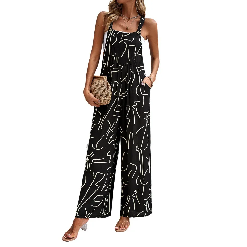 Casual Printed Jumpsuit Strap Women's Jumpsuits Rompers Wide Leg Long Pants Playsuits
