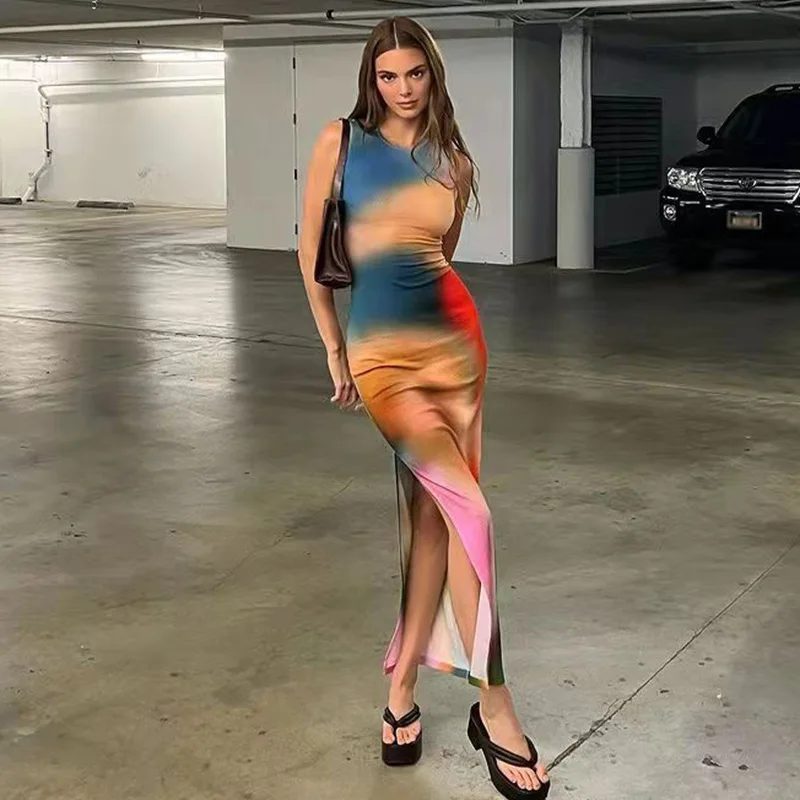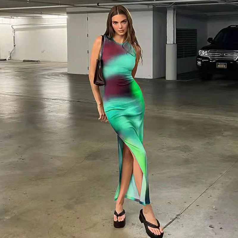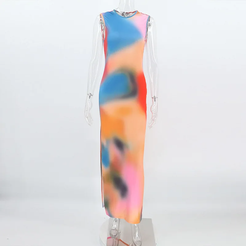 2026 Women's Sleeveless Split Tie Dye Bodycon Dress Slim Fit Digital Printed Natural Waistline Eco-Friendly and Washable