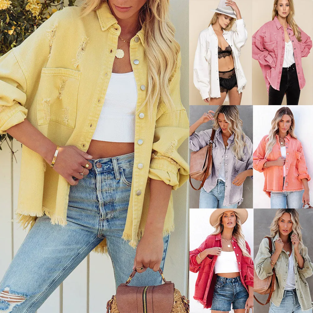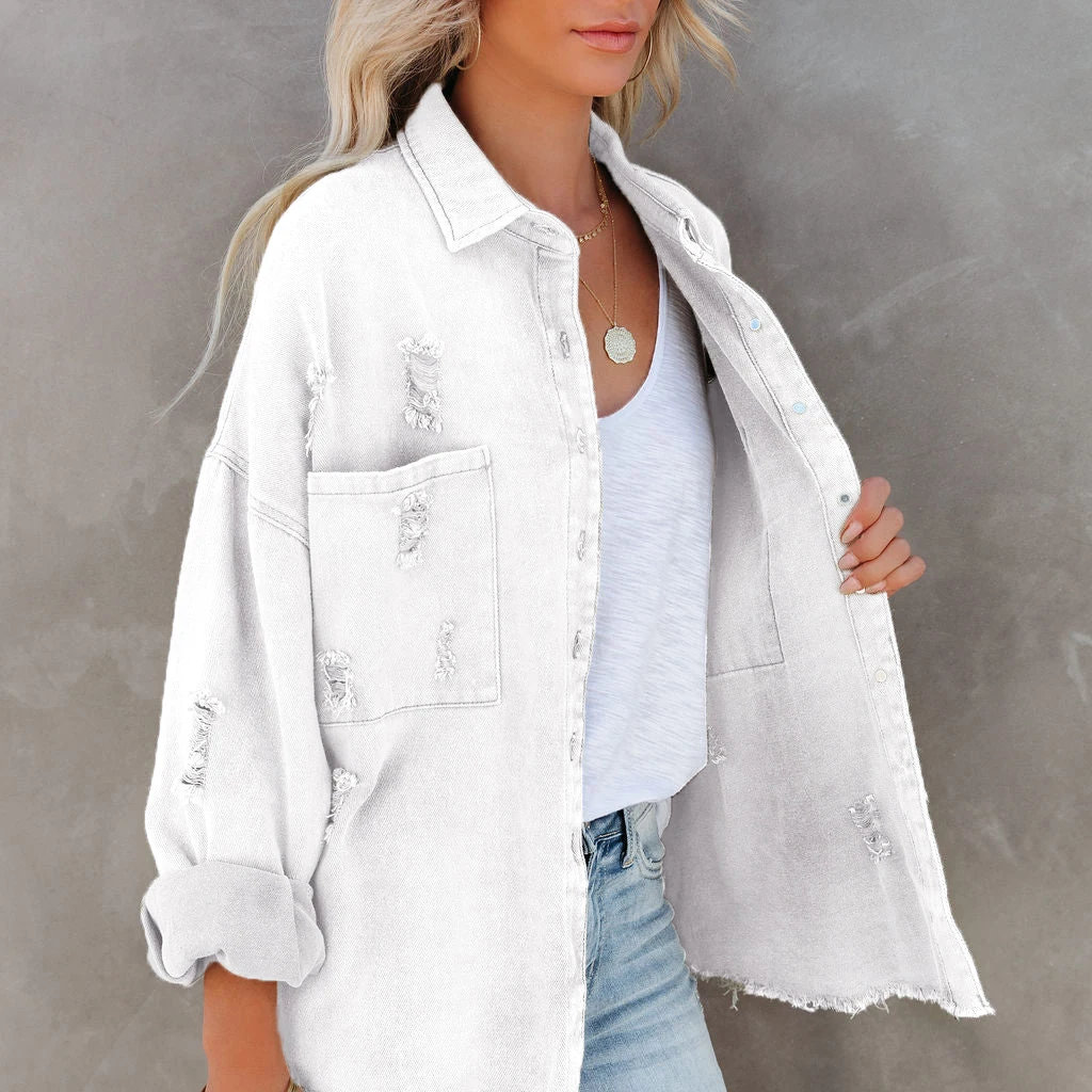 Bohemian Women's Printed Distressed Denim Jacket Breathable with Washed Effect Ripped Loose Hole Design