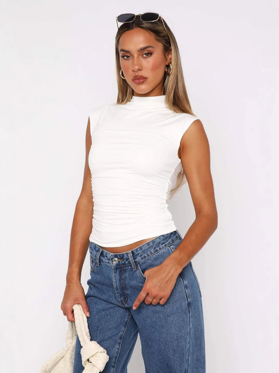 2026 New Women's Summer Crop Tops Independent Station's Simple Half-High Collar Sleeveless Pleated T-Shirt Casual Slim Fit