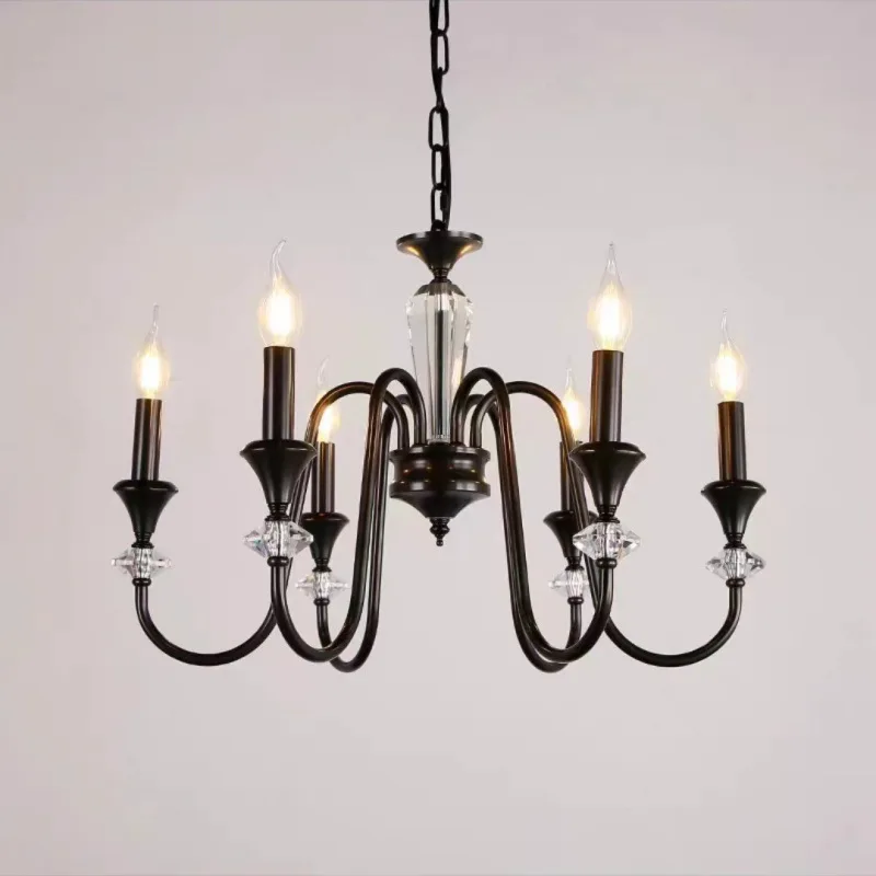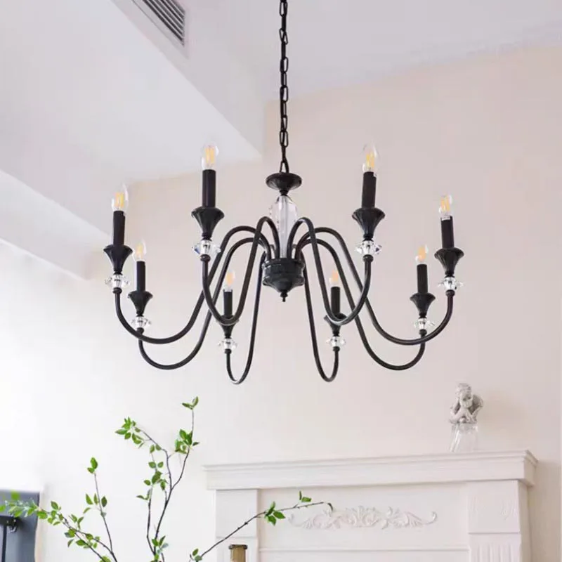 JACKSUN Black Iron American Vintage Crystal Chandelier French-Style Living Room Luxury Candle Lighting Study Master Bedroom