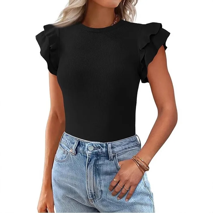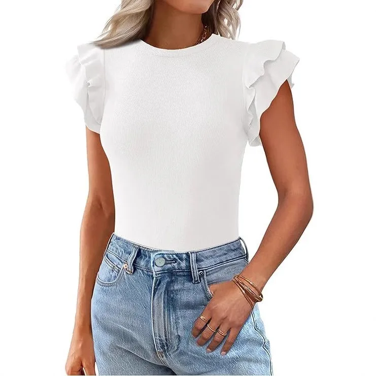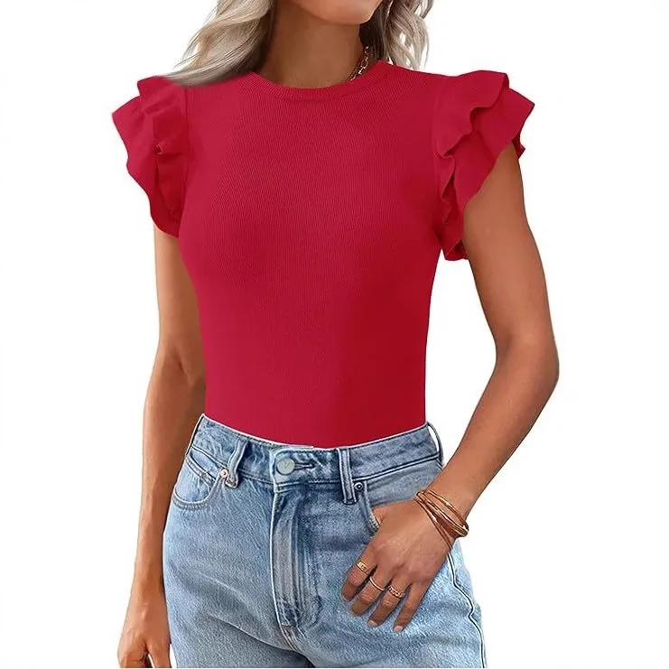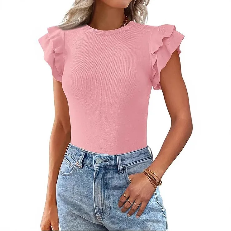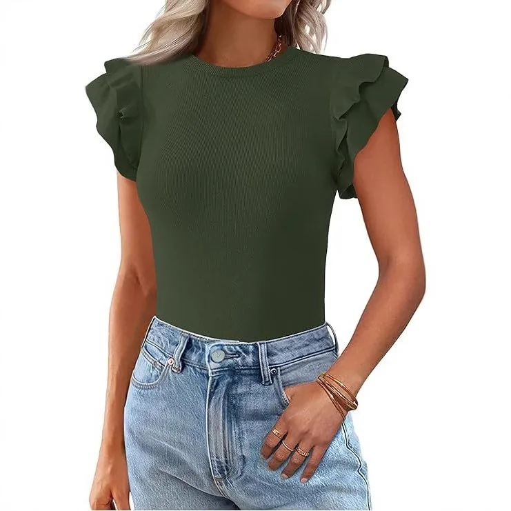 2025 Summer Women's Round Neck Casual Solid Color Ruffle Short Sleeved T-shirt