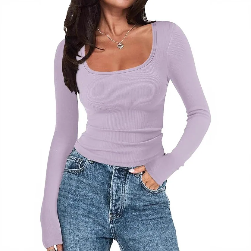 2025 Spring and Autumn Women's Fashion Long Sleeve Square Neck Casual Tight Match Color Shirt