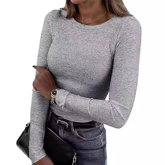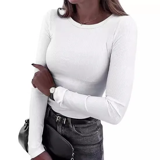 New Autumn Fashion Women's Long Sleeved Elastic Round Neck Ribbed Slim Fit T-shirt
