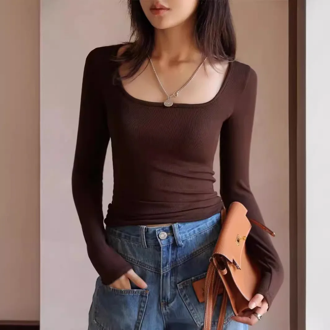 Summer Women's square Neck Ribbed Fabric Base Shirt Black Fashionable Casual T-shirt