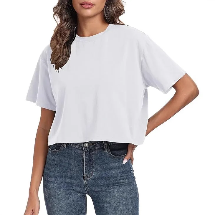 Summer Women's Loose Short Round Neck Exposed Navel Casual Solid Color T-shirt
