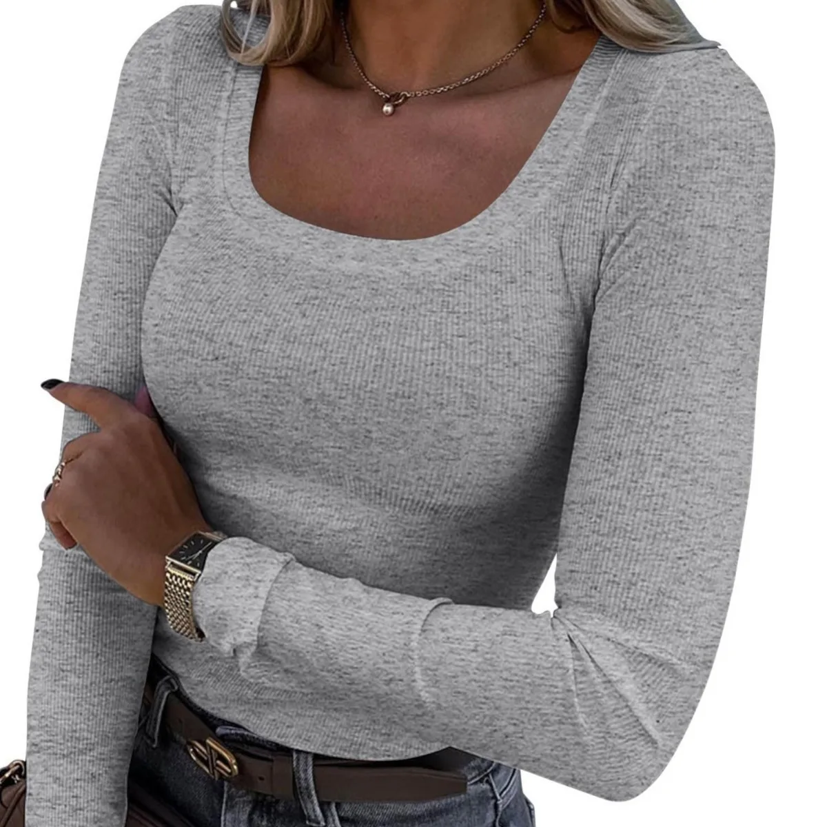 Spring and Summer Women's Threaded Pit Strip Slimming Long Sleeve Square Neck T-shirt