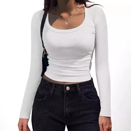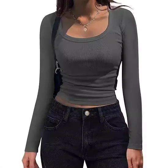 Spring and Summer Women's Threaded groove Strip Slim Fit Long Sleeved square Neck Casual T-shirt