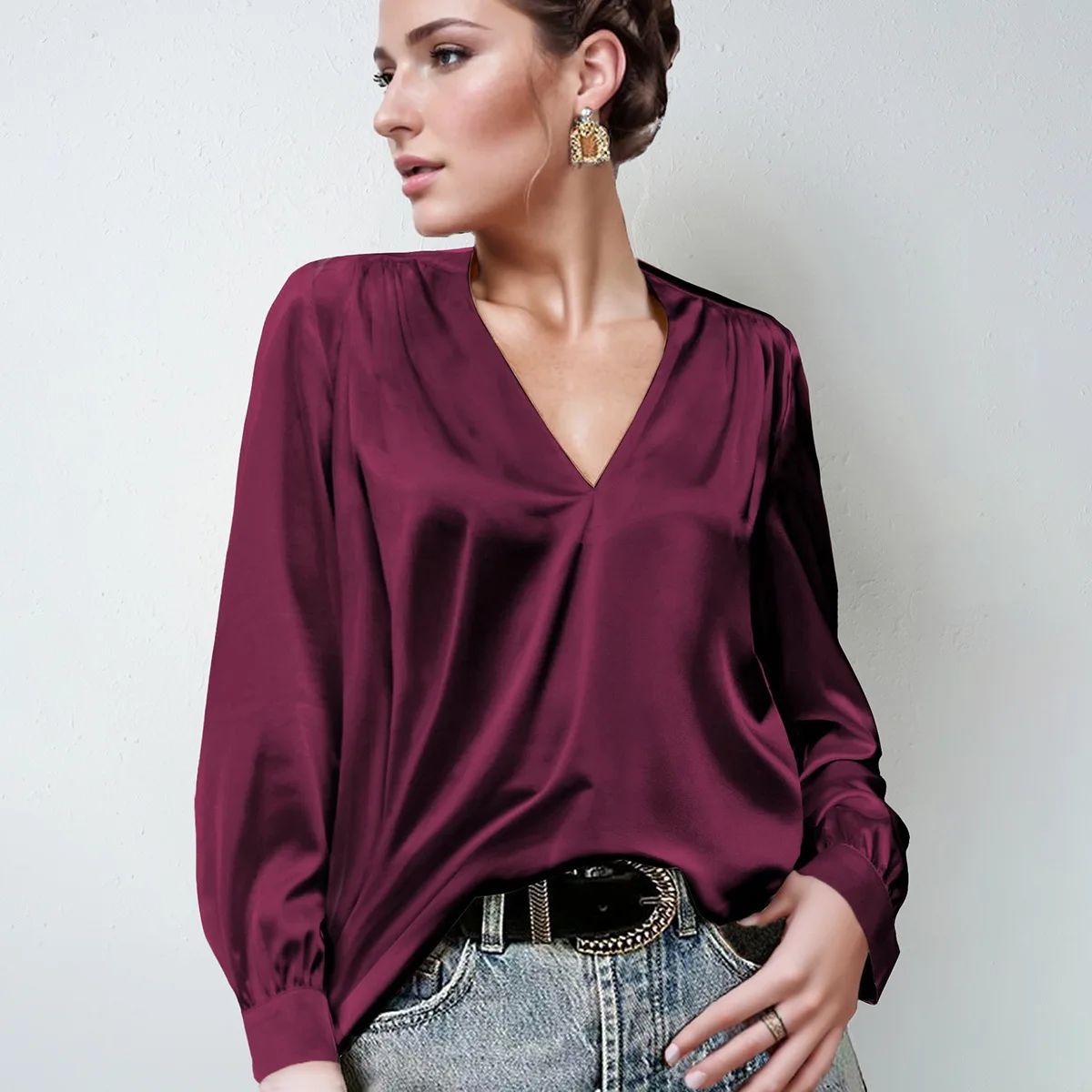 2025 Women's Satin Pleated Long Sleeved V-neck Casual Loose Top