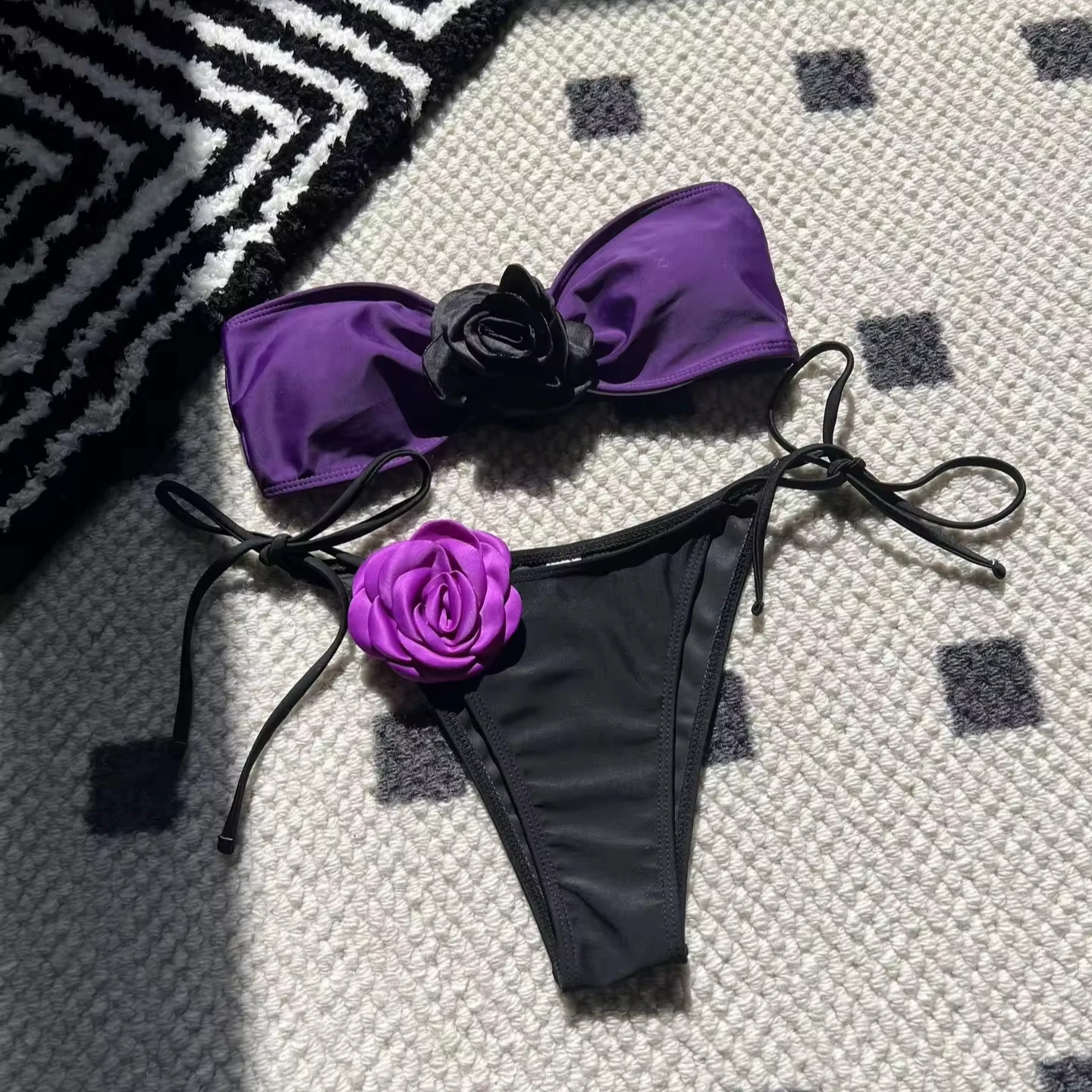2025 Custom Factory Color Blocking Rose Bra with Drawstring Strap and Splitg Female Bikini