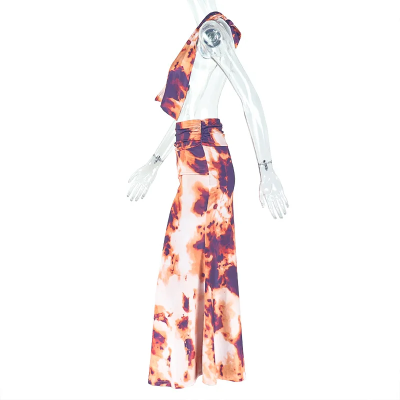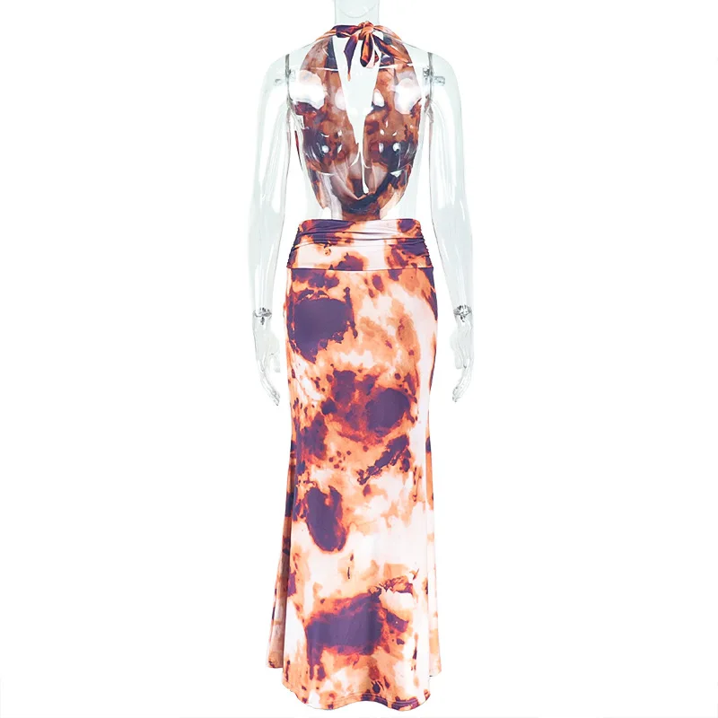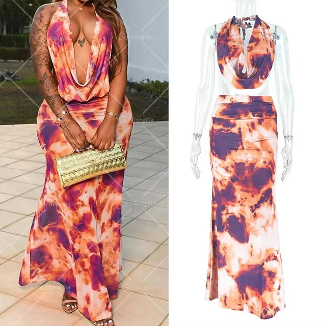 GX1751 Fashion Summer Clothing Vendor Street Wear Printed Sleeveless Irregular Halter Tops and Maxi Skirt 2 Pieces Sets