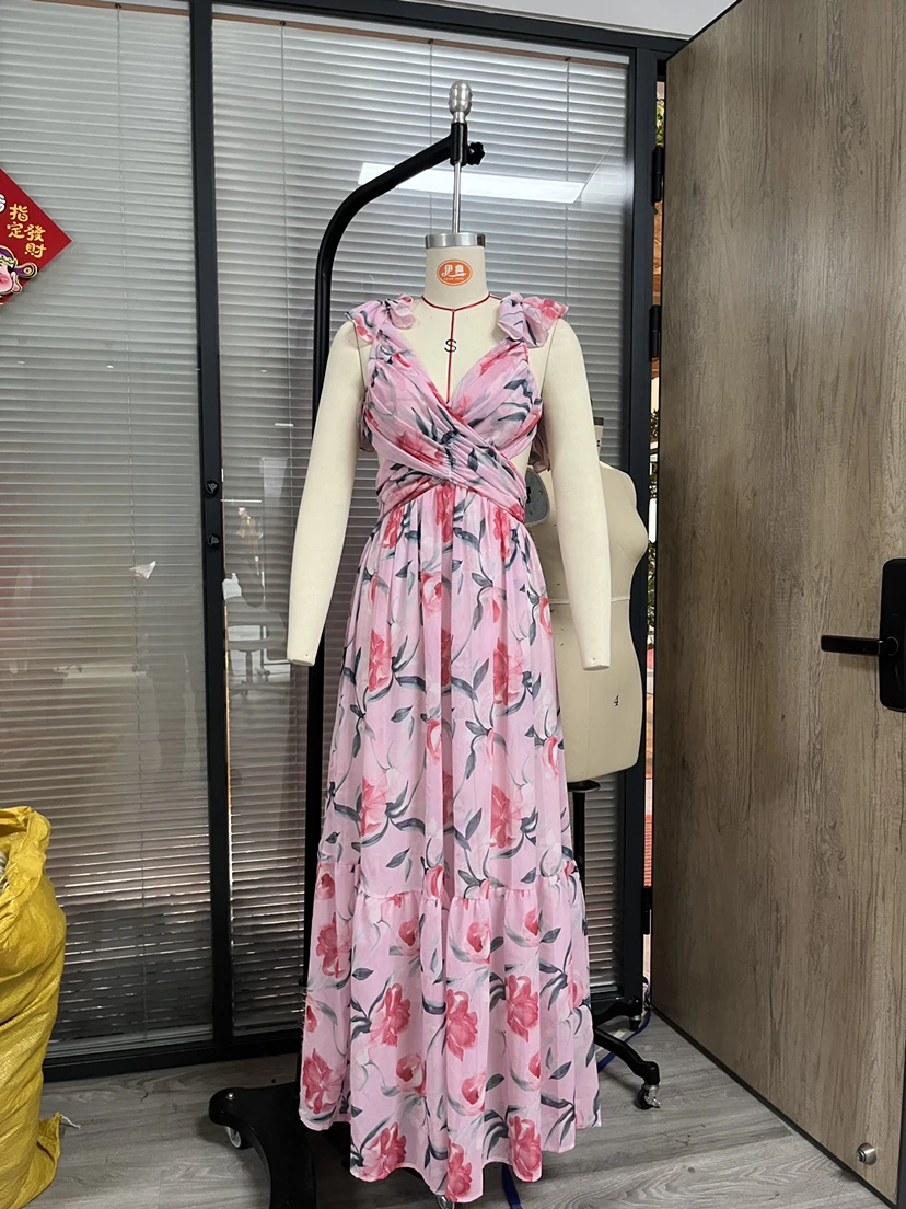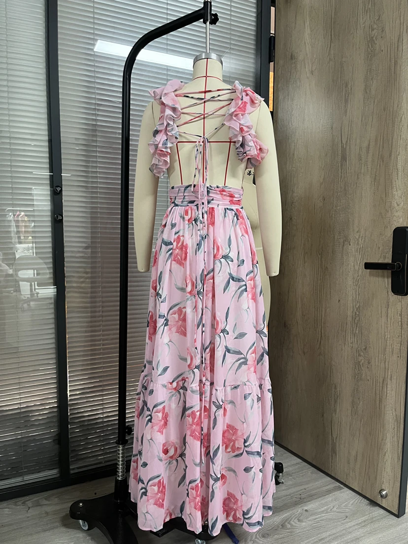 GX8719 Fashion 2025 Women Clothing Boutique Sleeveless V-Neck Backless Printed Maxi Dress Elegant Casual Long Dresses