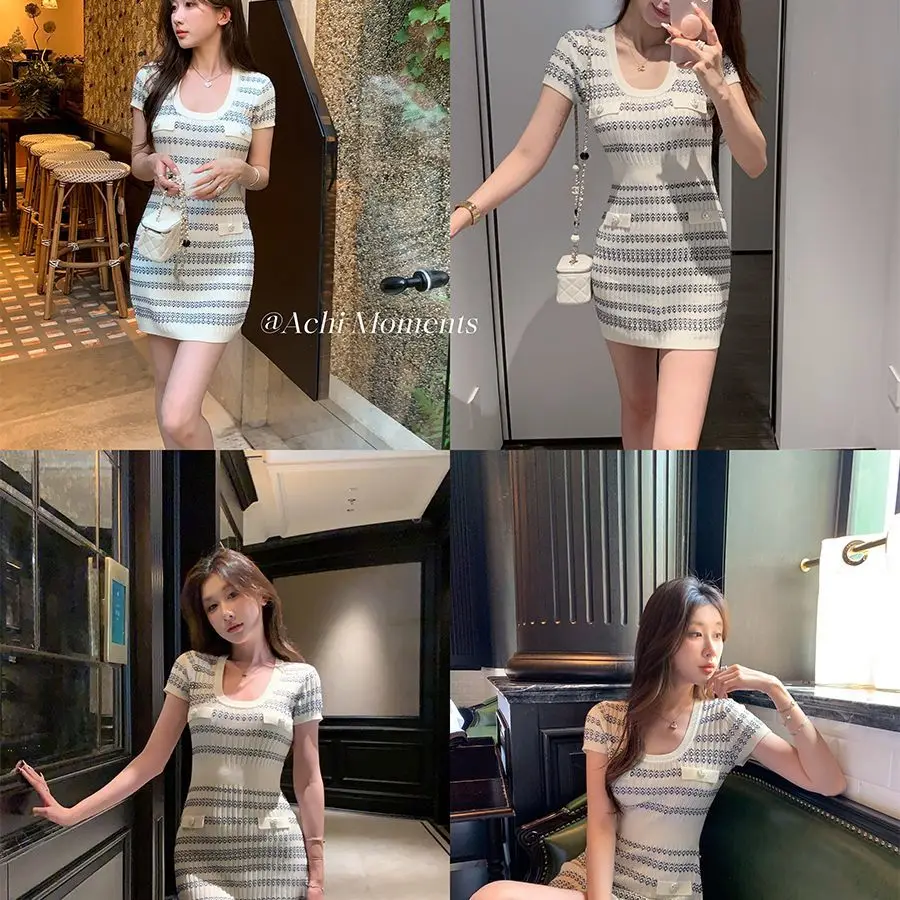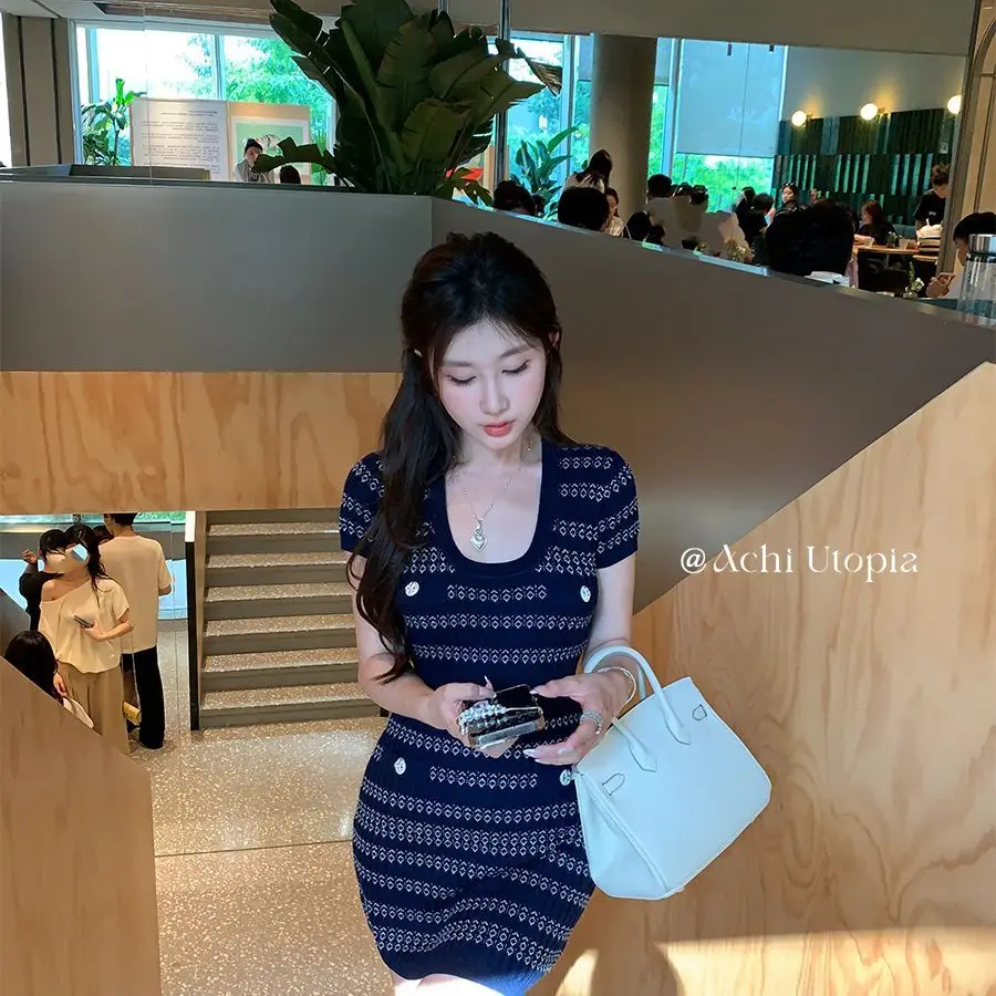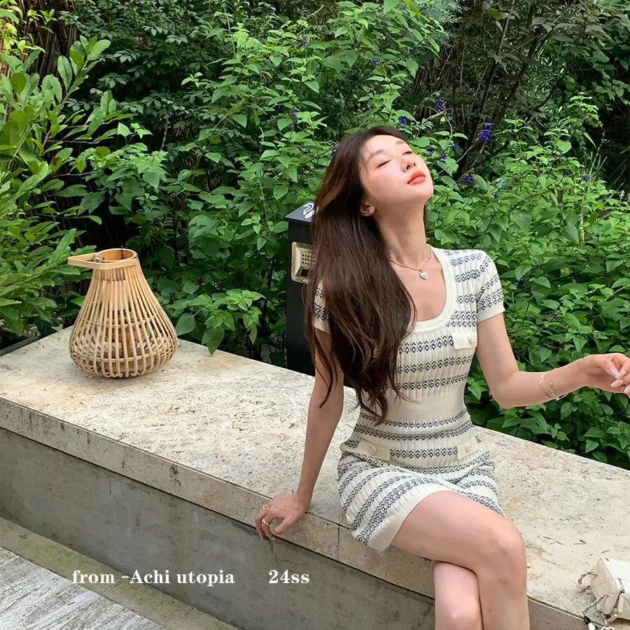 Spring and Summer Women's Summer V-neck Short-sleeved Vertical Stripe Circular Pattern Waist Swing A-Line Knitted Dress