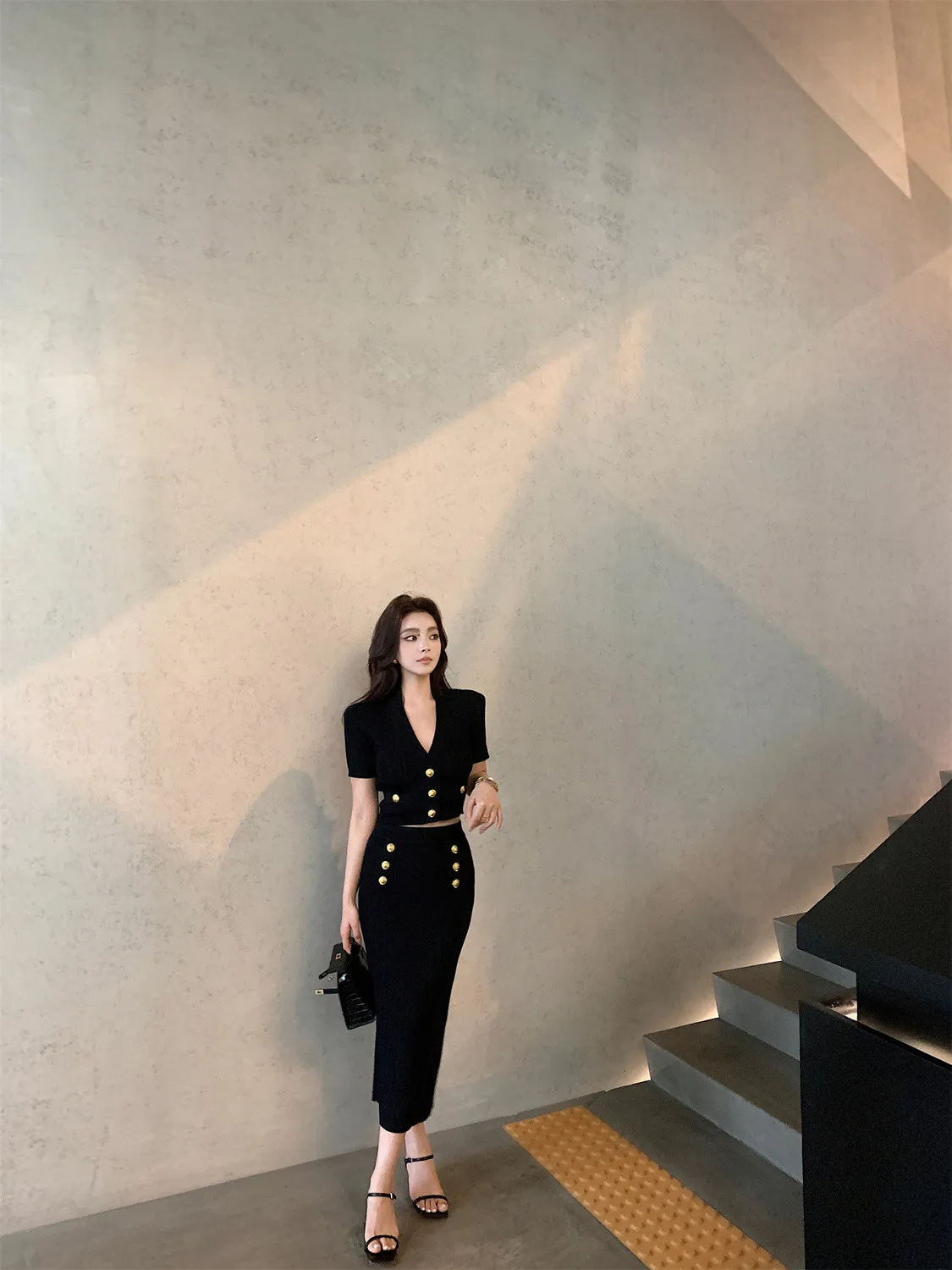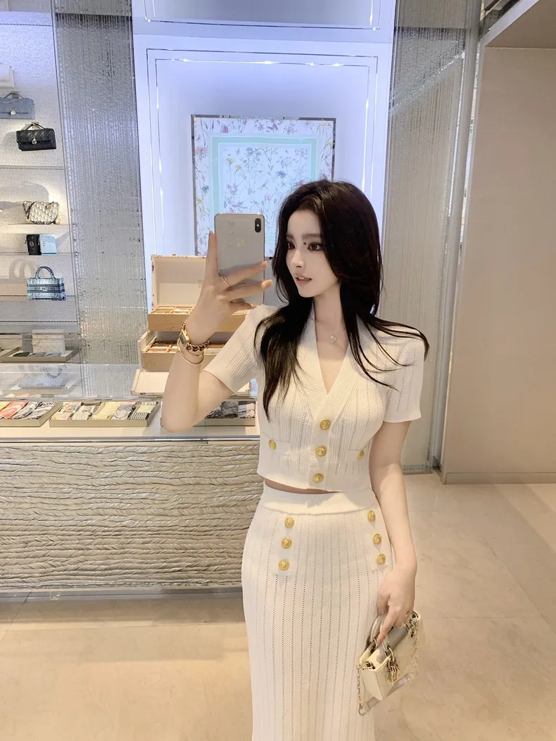 Fashion Knit Set Short Sleeve Cardigan and Skirt Suit Female Two Piece Set Women Sweater Knitted Skirt Set