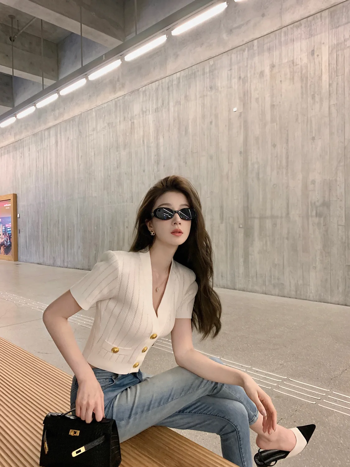 ZYHT 82024 White Blouse with Ruffled Cap Sleeves V-Neck Blouses Et Chemises Pour Femmes White Blouses for Women