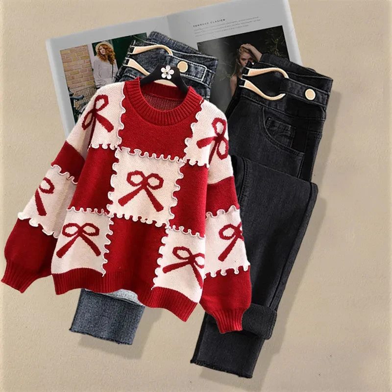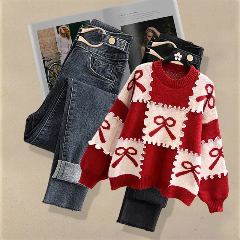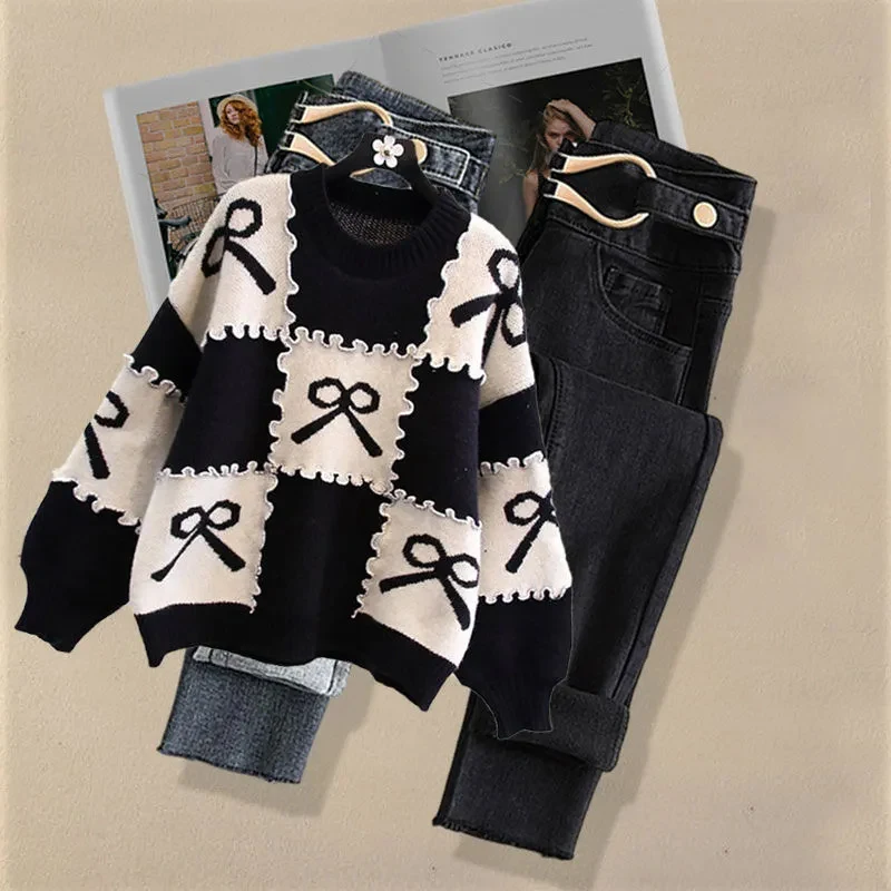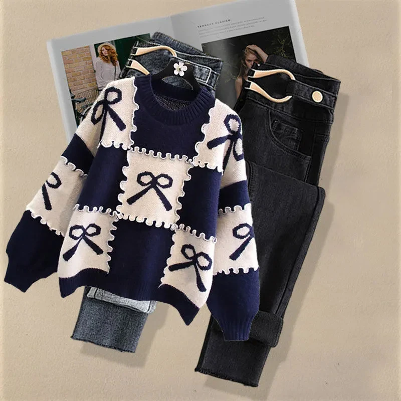 Autumn Fashion Loose Long Sleeve Knitted Pullover and Jeans Two-piece Set for Women