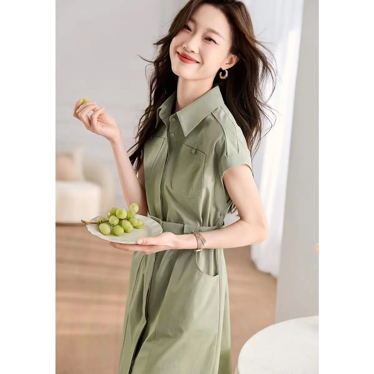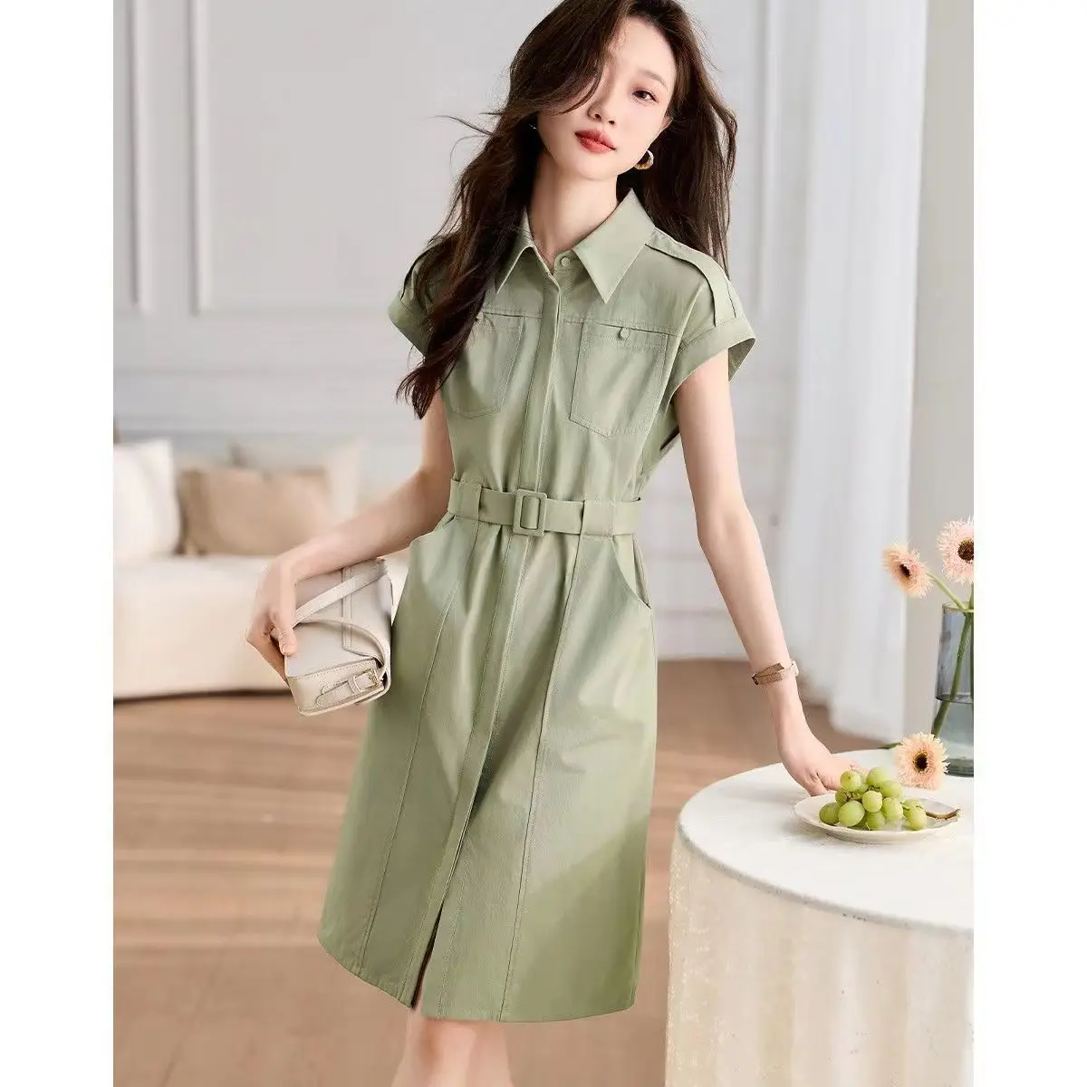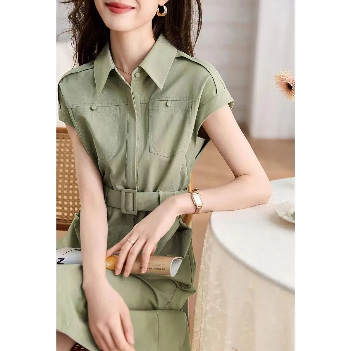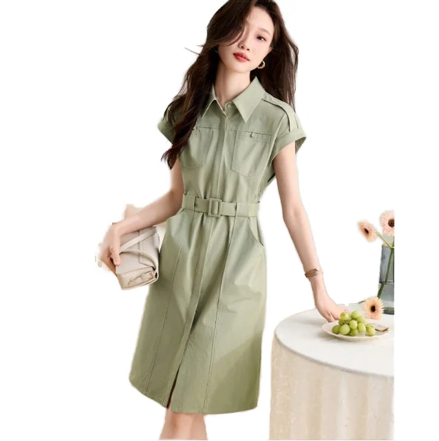 Wholesale Summer French Temperament Women's Slim Design Tooling Belt Stitching Casual Knee-Length Button for Commuting
