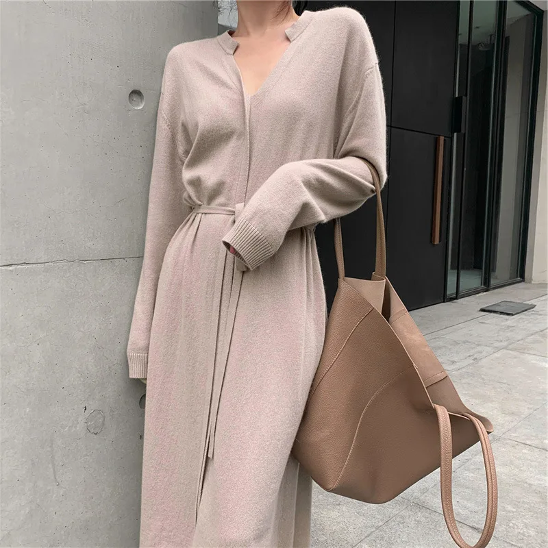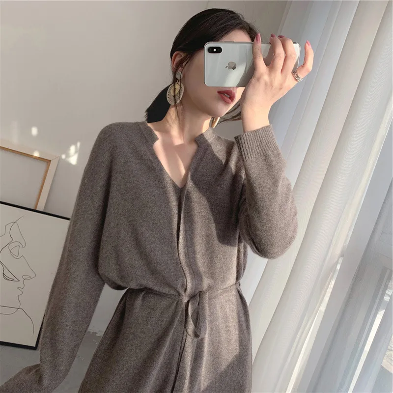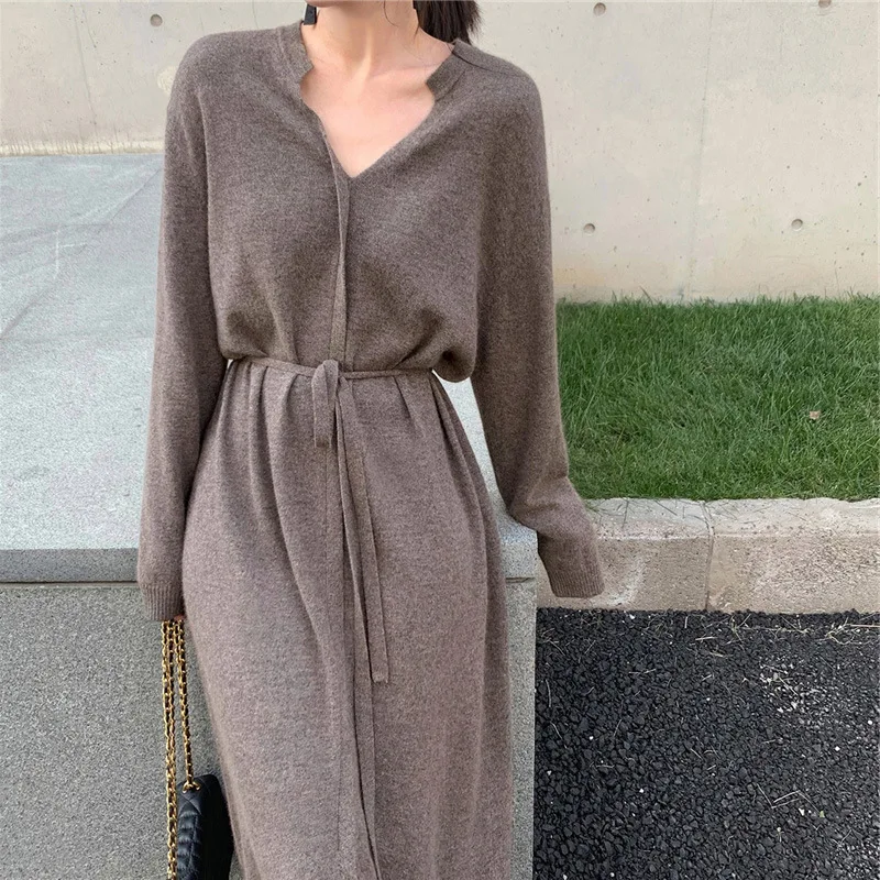 Autumn Winter Vintage Casual Dress for Women Elegant Mid-Length Knitted Bodycon with Long Sleeves Empire Waistline Simple Style