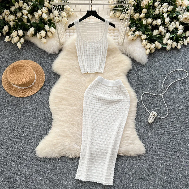 Boutique Wholesale Women's Summer Retro High Waist Skirt Set New Versatile Knitted Solid Canvas Casual Style