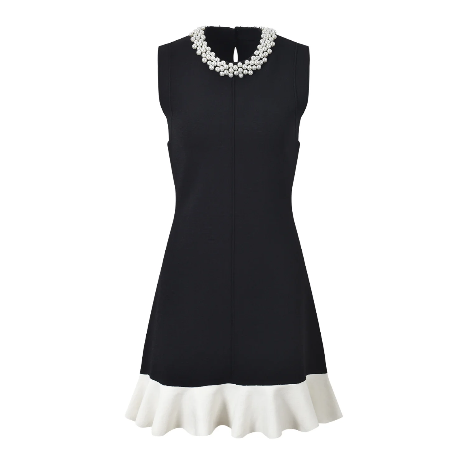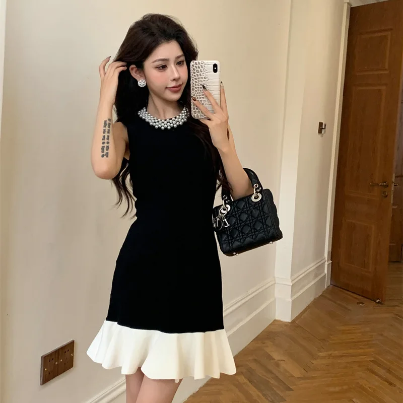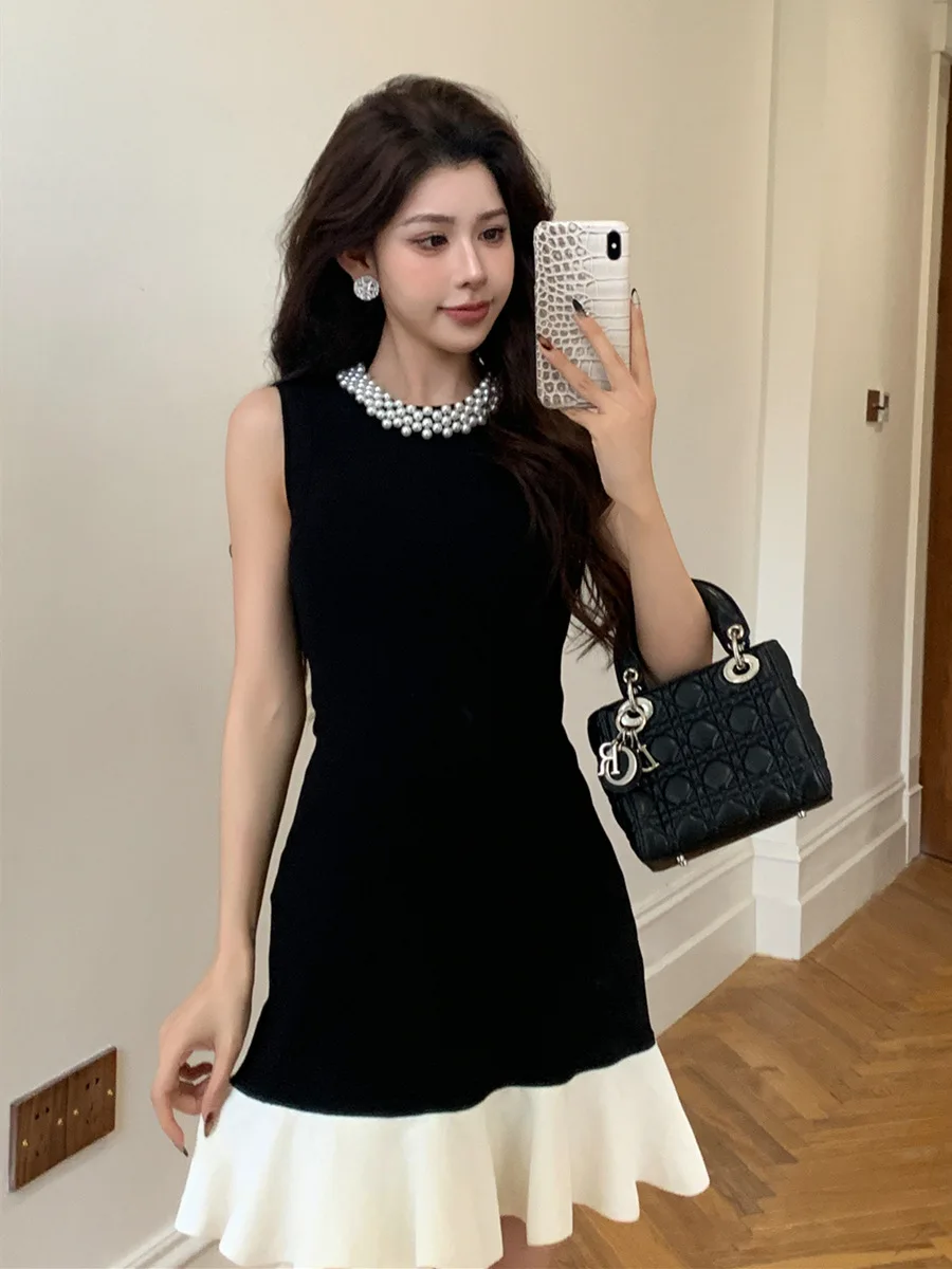 French Small Style Delicate Pearl Elegant Sleeveless Ice Silk Knit Dress Summer Ruffled A-line Knit Dress Female