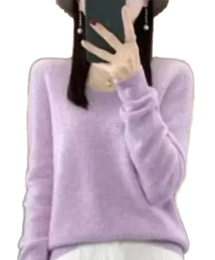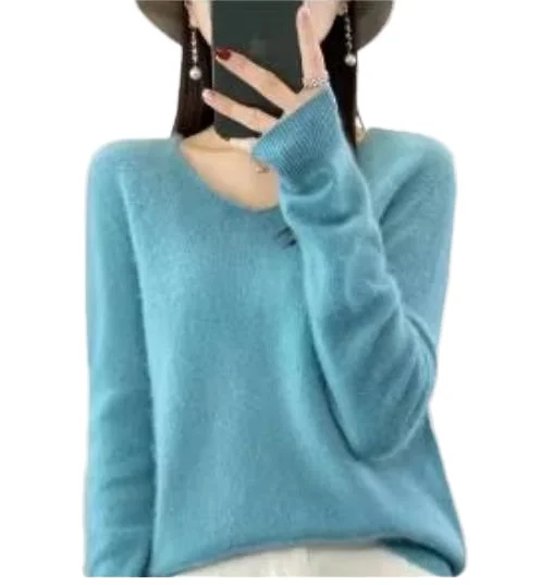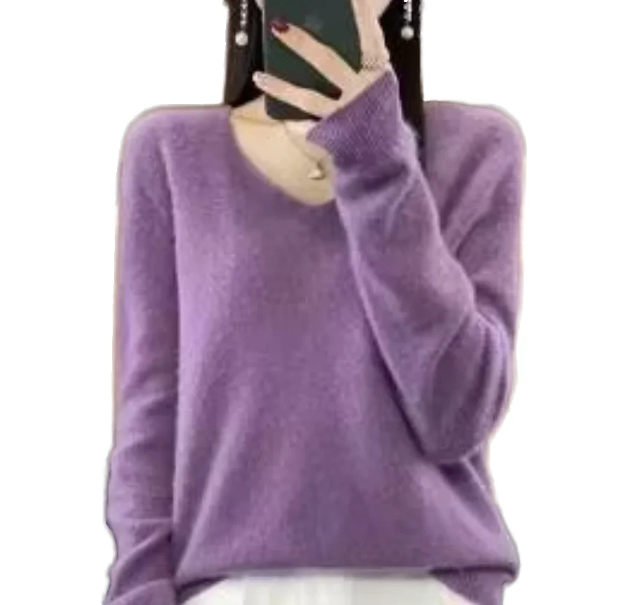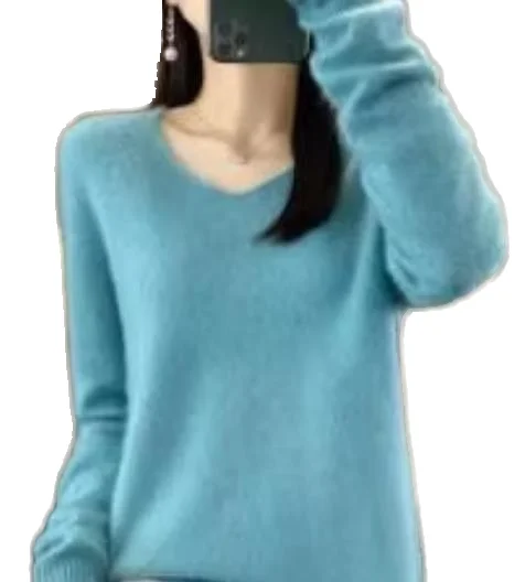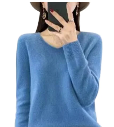 Women's V Neck Pullover Knit Loose Bottom Sweater Autumn/Winter New Solid Color Breathable Casual Style