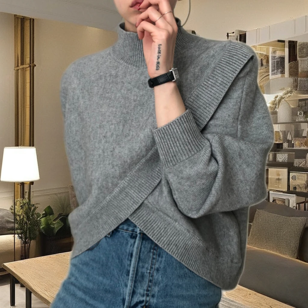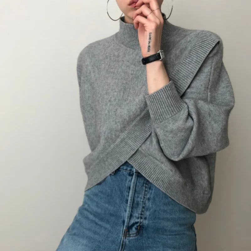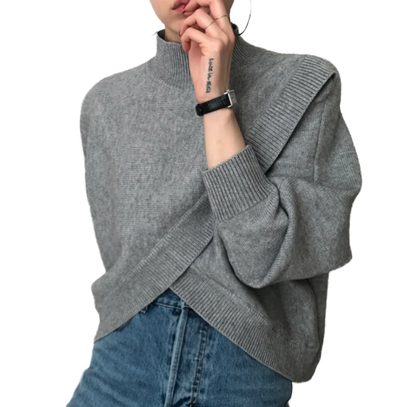 Autumn Wholesale New Design Half-High Collar Cross Irregular Knitted Pullover Long-Sleeved Loose Solid Color
