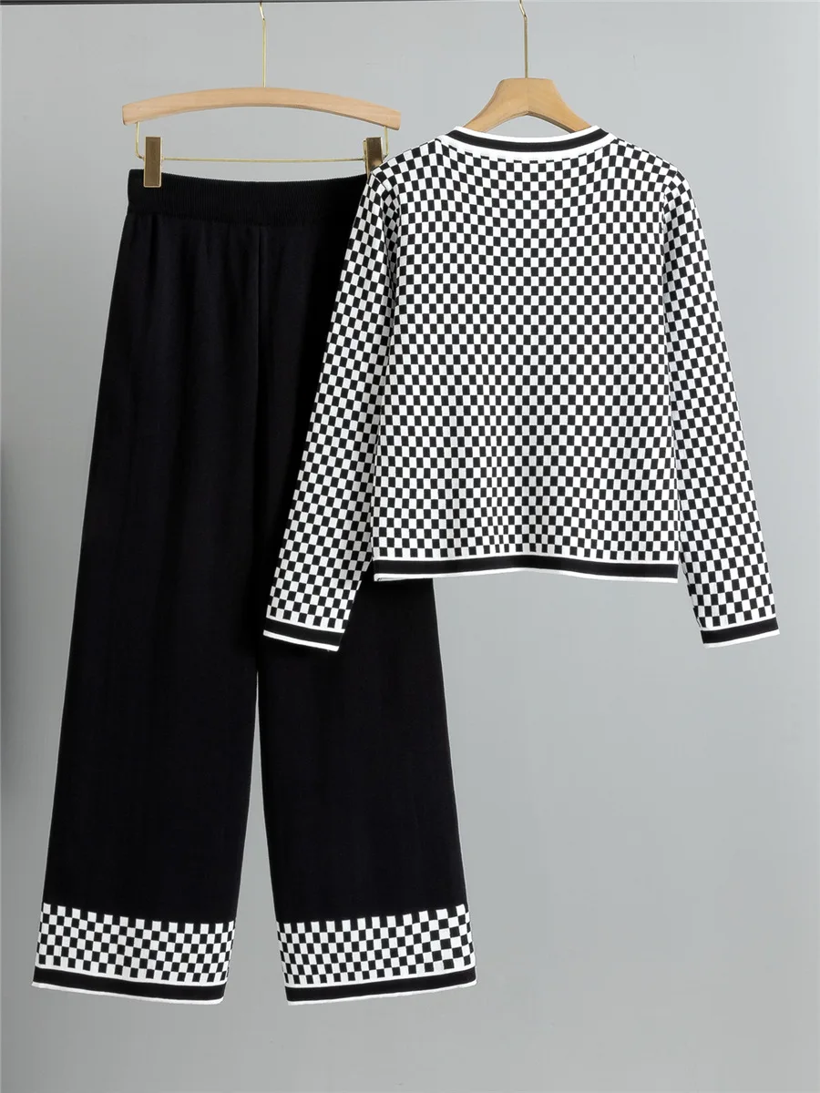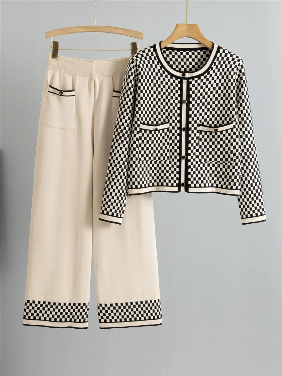 Women's Plus Size Casual Knitwear Two Piece Set Long Sleeve Cardigan Top Button Wide Leg High Waist Pants Office Suits Winter