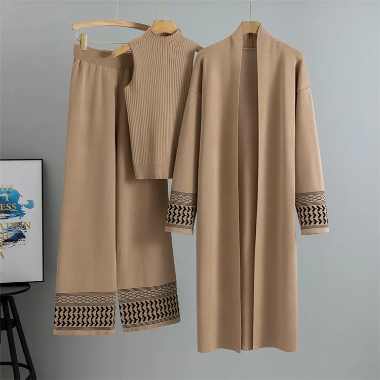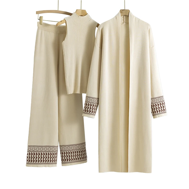 Spring Autumn Solid Color Cardigan Knitted Set Elegant Knitted Cardigan and Vest and Pants Set Knitted Three-piece Set for Women