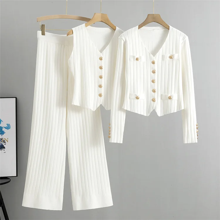 Spring Autumn Solid Colour Vest Knit Set Casual Knit Cardigan and Sleeveless Vest and Pants Set Knitted Two Piece Set for Women