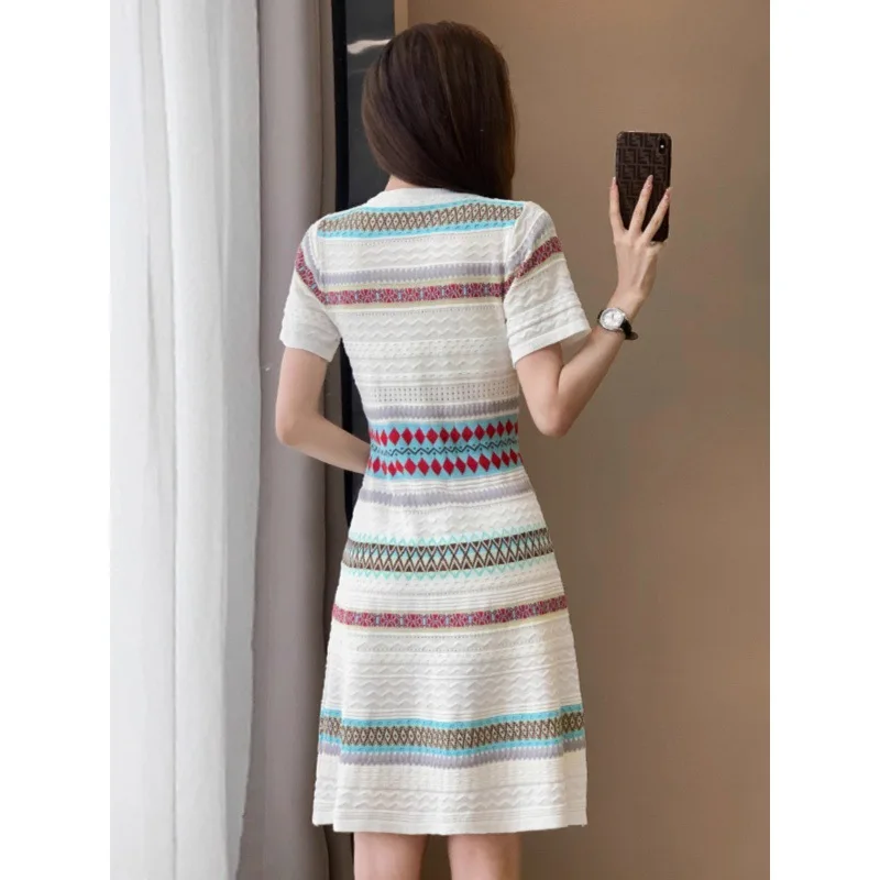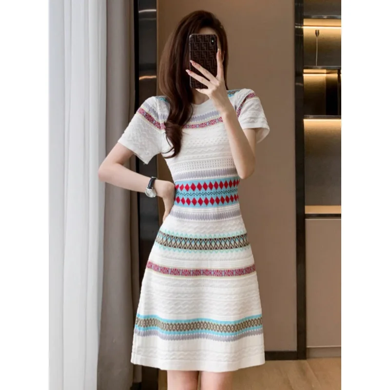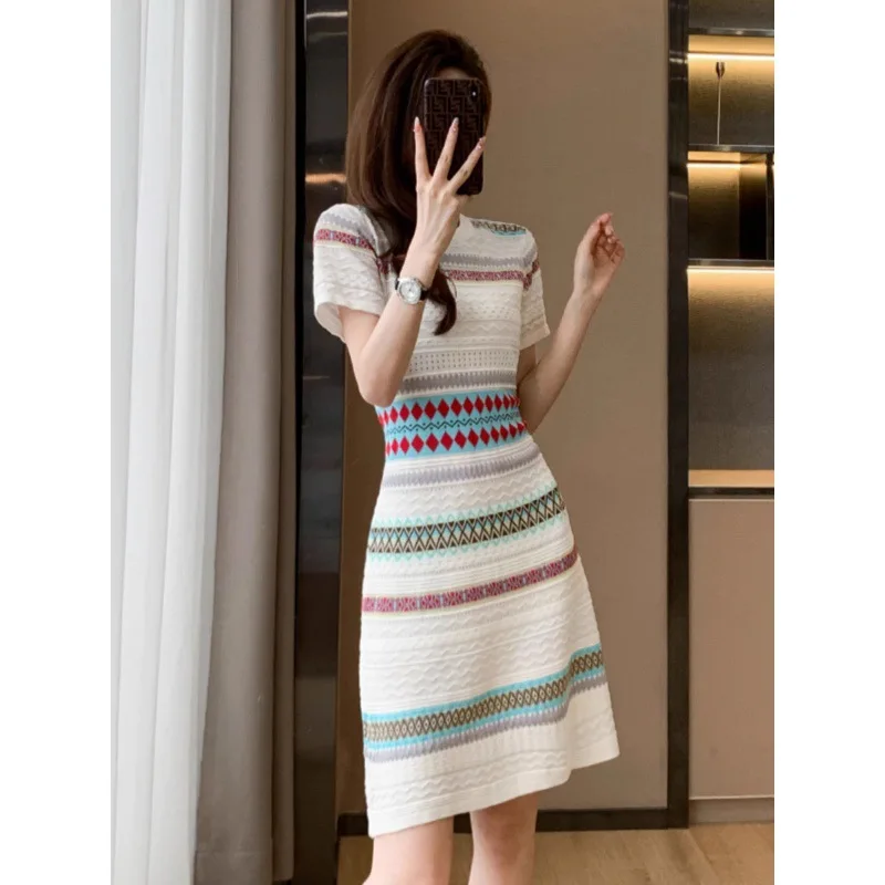 Women's Vintage O-Neck Dress for Summer Elastic Waist Knit Dress with Spandex Lining Knit Short Sleeves Dress for Women
