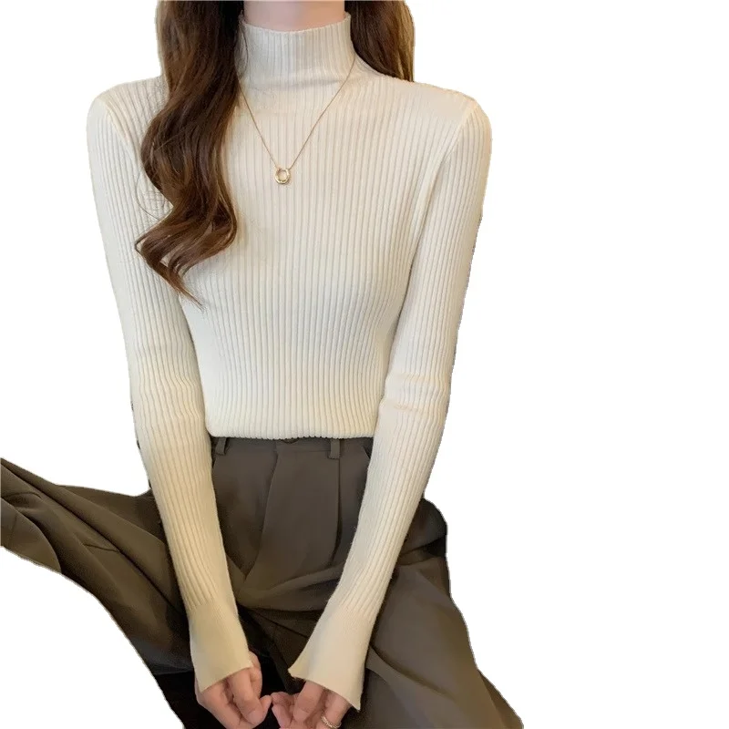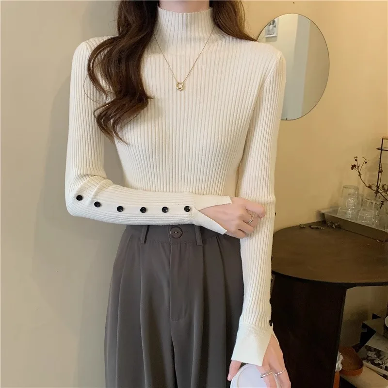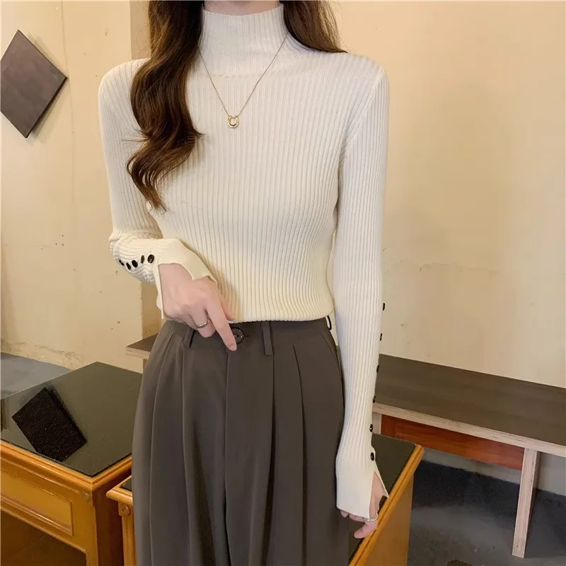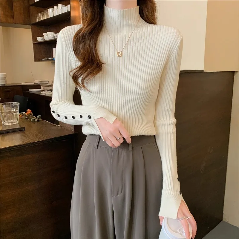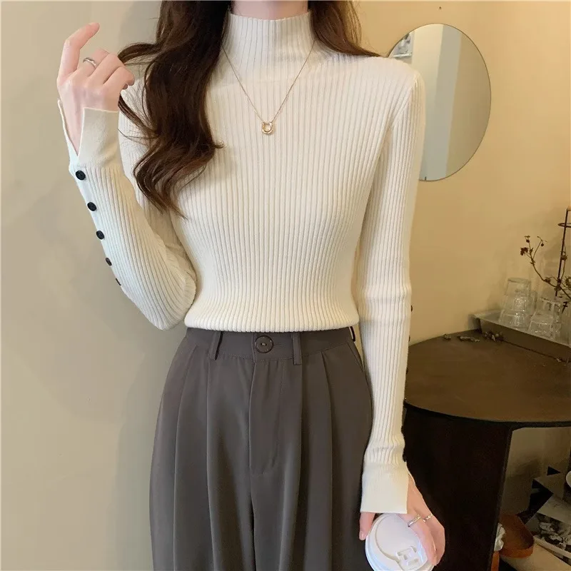 Autumn Winter Half High Collar Pullover Thickened Slim Bottom Shirt Sweater Button Sleeve Top Knitted Pullover Sweater for Women