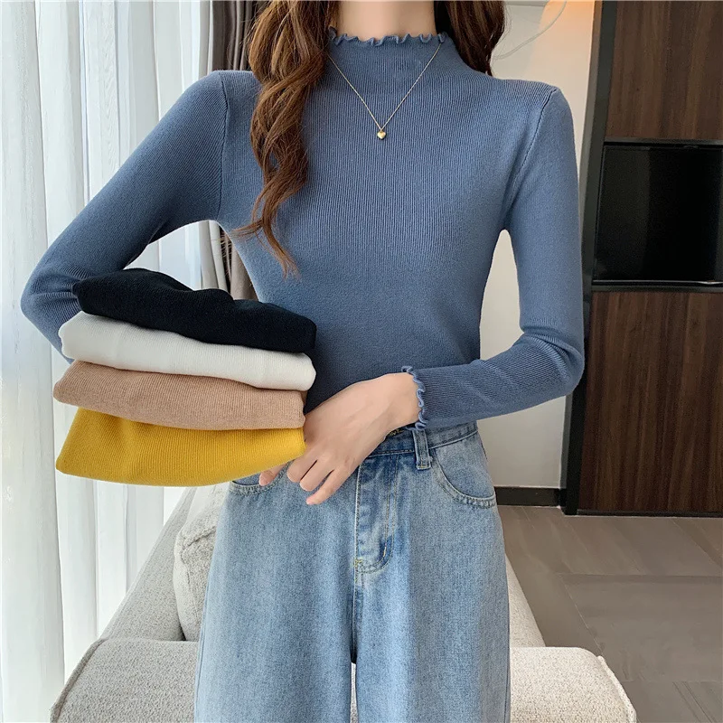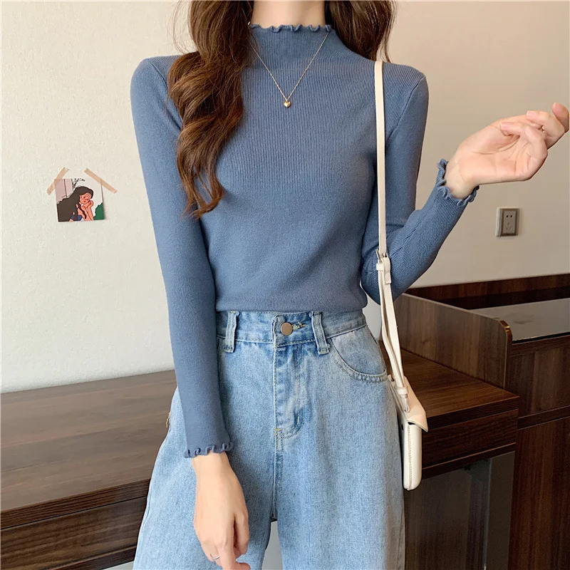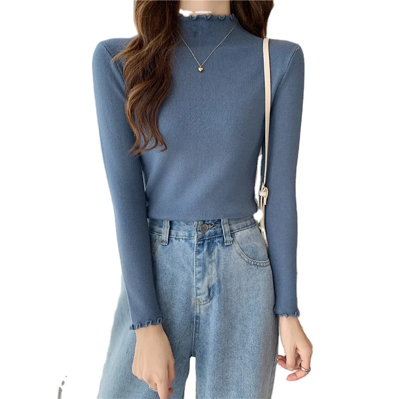 Autumn and Winter New Slim Long-sleeved Bottoming Knit Sweater Ruffled Top Half-high Neck Knitted Pullover Sweater Women