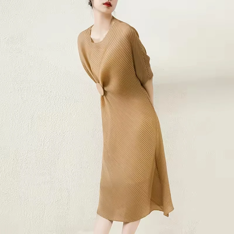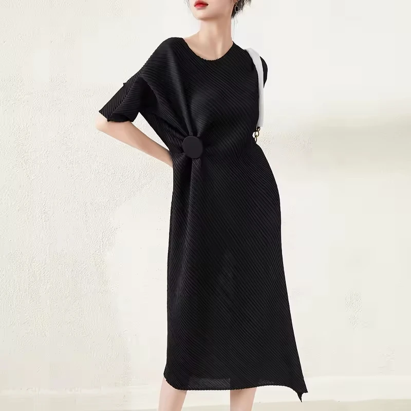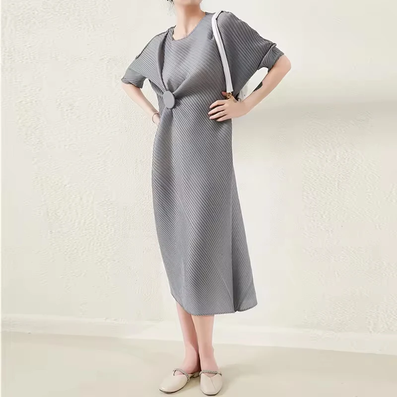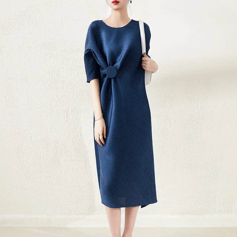 Wholesale 2025 Miyake Pleated Midi Woven Dress Natural Waist Loose Leisure Buckle Solid Color Collar Women Casual Style Dresses