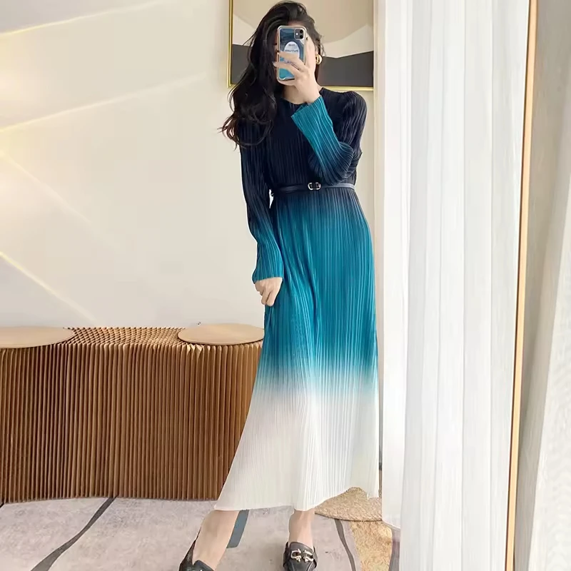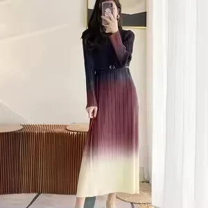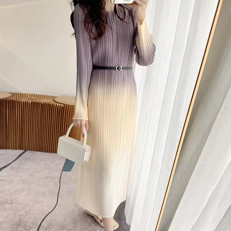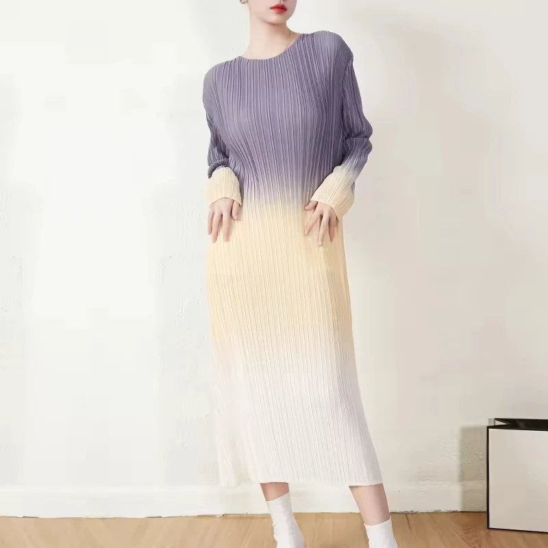 Factory Direct Sales High Quality Miyake 2025 New Stylish Pleated Gradient Long-sleeved Women Casual Style Dress