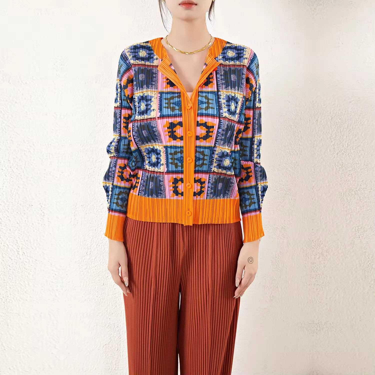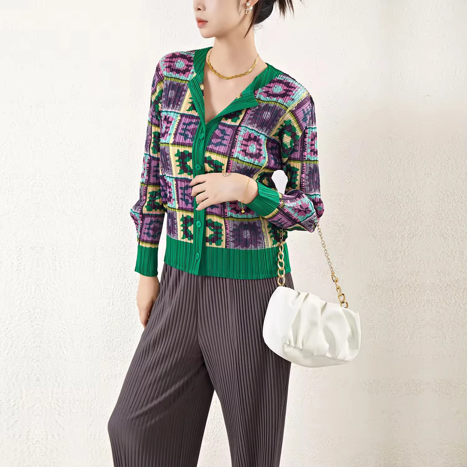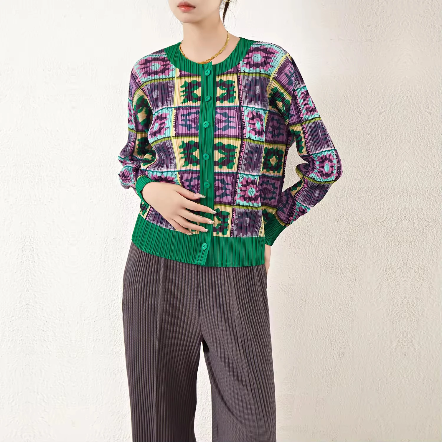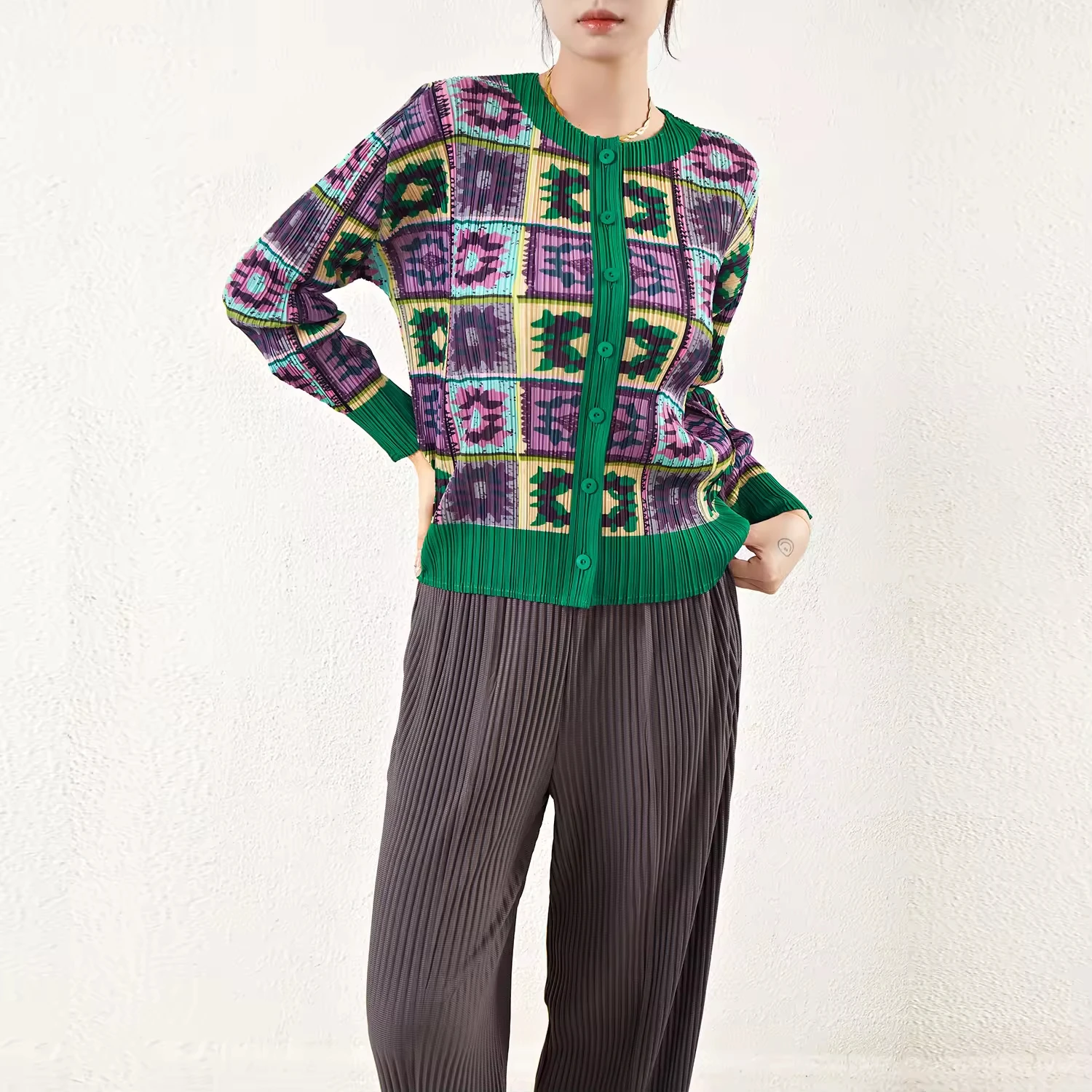 High Quality Ladies Cardigan Miyake Pleated Printed Waist Top for Women Breathable Long Fashion Top with Button Design