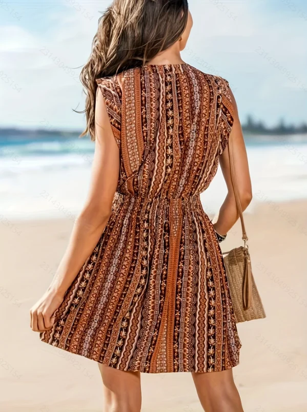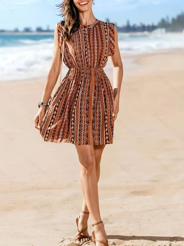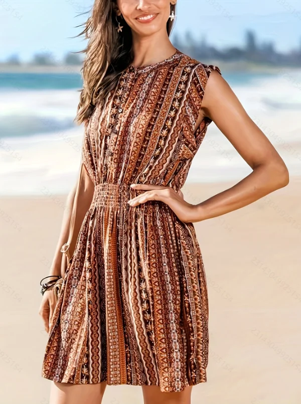 Casual A-Line Mini Dress Natural Print Breathable Polyester Woven National Style for Holidays Above Knee Length